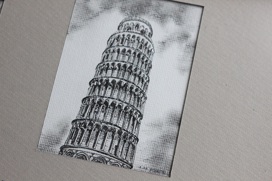 こちらの建物は、皆さんもご存知のイタリア世界遺産、ピサの斜塔。今回は、この絵を描いた広報・進藤の紹介です。彼女は、建築学科を専攻し、学生時代はヨーロッパに一か月も旅行。こちらはその旅先で描いたスケッチだそう。