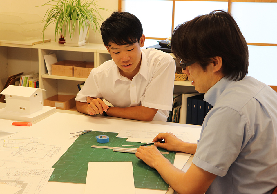 環境都市工学科の西川嘉雄先生が、住宅設計を学びたいと希望されたM君に、