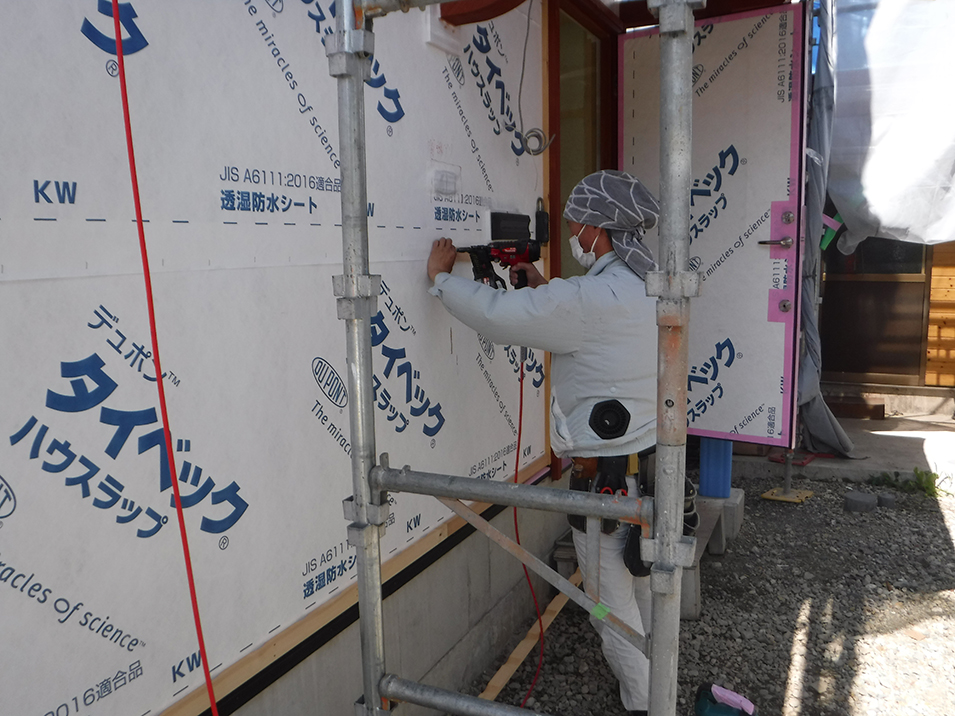 大工2人目、外部の透湿防水シートを施工中の横川さん!