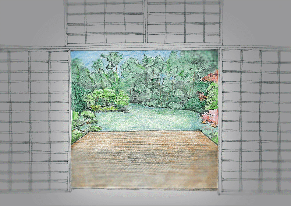 障子と月見台で縁どられた“まど”で水面の割合が大きい構図をつくることで
