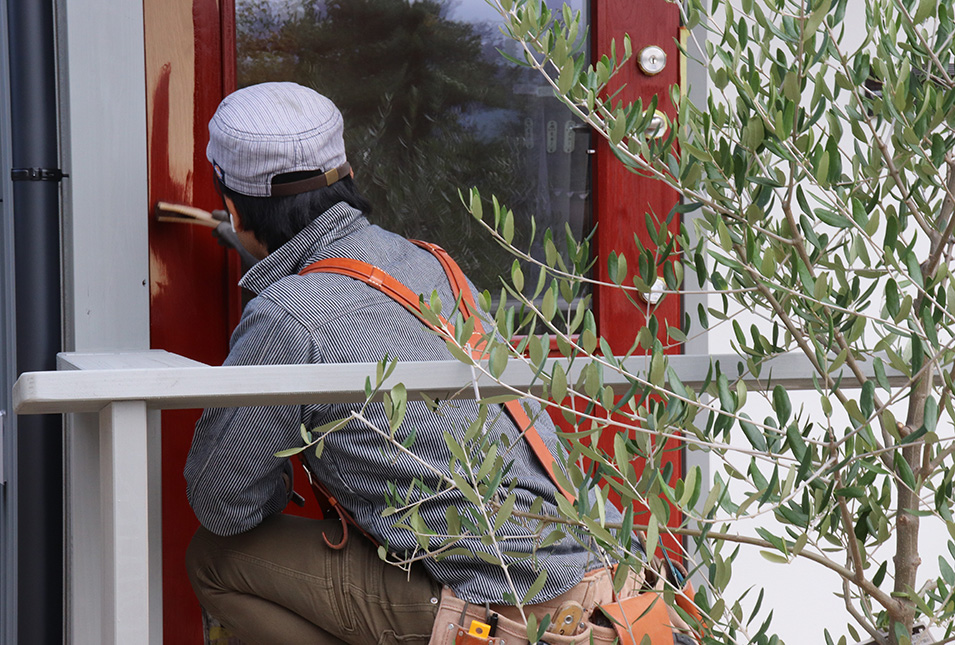 須坂市のS邸、いよいよ完成となります。 玄関まわりの仕上げの塗装工事に入ります。玄関ドアをオリジナル色に着色。 ご指名の職人石川さんのよる、刷毛塗り仕上げになります。 シンボルツリーのヤマボウシ、玄関前にオリーブの木が植えられて アプローチが華やかになりました。家構えに表情が出てきます。