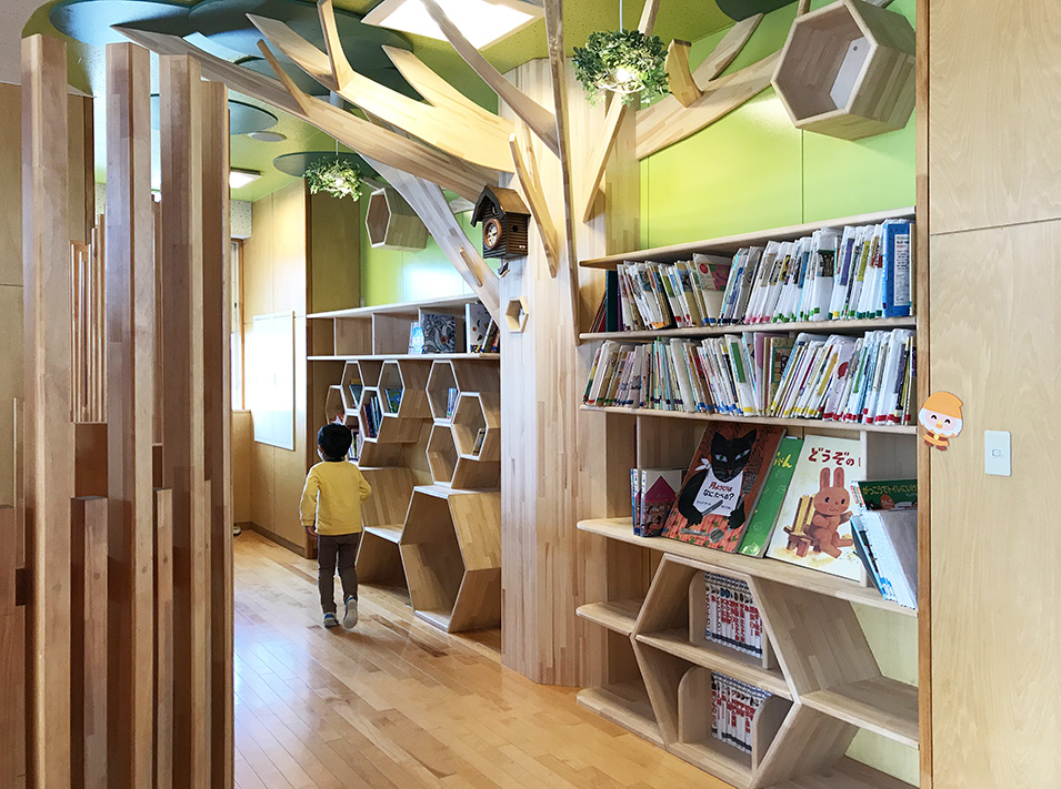 長野市の朝陽学園さん、昨年に設置しました絵本コーナー(フクロウが住む大木)を見て参りました。フクロウも宿り、子供たちも「ここはね、、、」と嬉しそうに話かけてくれました。成長が著しい時期、空想の世界を広げて豊かな心身が育つよう、コンセプトを考えております。夢の世界と現実の世界を自由に行き来してほしい。そんな想いを込めて、私自身も自由な発想で、プランニングします。こちらは、3歳児~5歳児棟の絵本コーナー。身体能力もお聞きして、安全に十分配慮することが大切です。