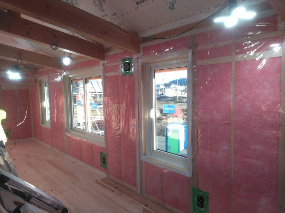 千曲市の現場、壁面のグラスウール断熱材の充填工事中です。
