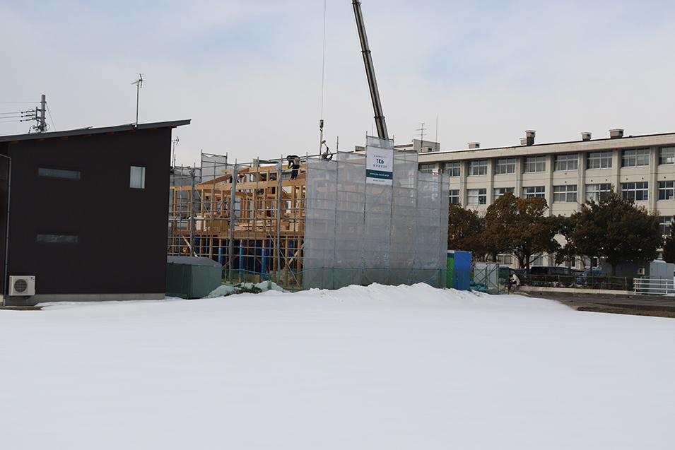 夕方の雪、雨が心配ですので、進行しながら、ブルーシートの養生も1階から行っています。