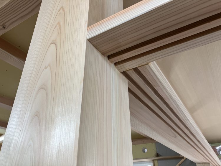 210角の檜柱、棟梁のカンナ掛によって、…
