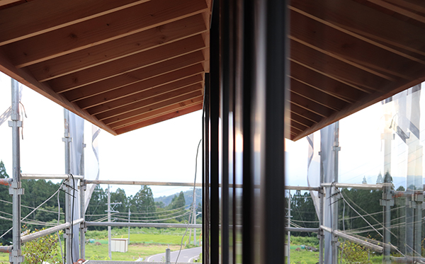 建築中のお住い、2階の寝室の窓に映り込む景色です。
