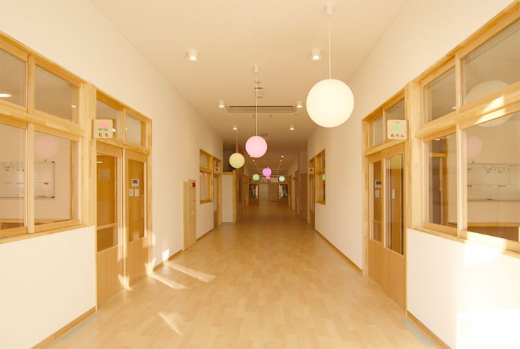 こちら、朝陽学園0.1歳児棟の保育室がならぶ廊下。「アトリウム」と名付けて、色が変化する大…