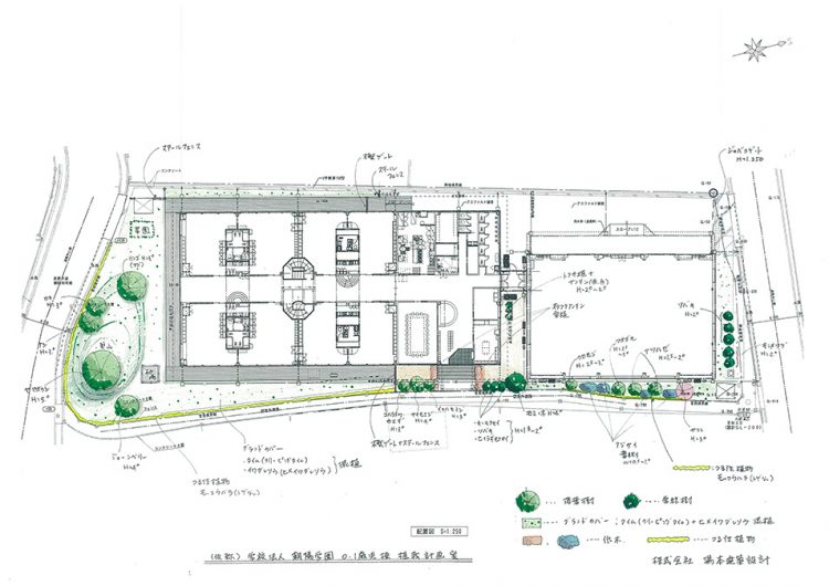 朝陽学園の園舎のお引き渡し後に、外構計画をしました。保育園ですので、安全面と楽しむ植栽を主…