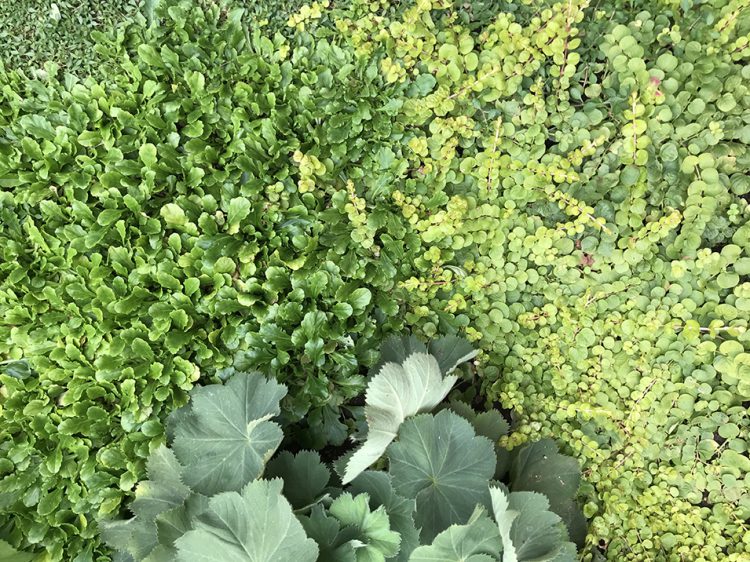 クラピア名人の奥様Wさん。グランドカバーの種類も増えて、緑色のグラデーションが美しい!