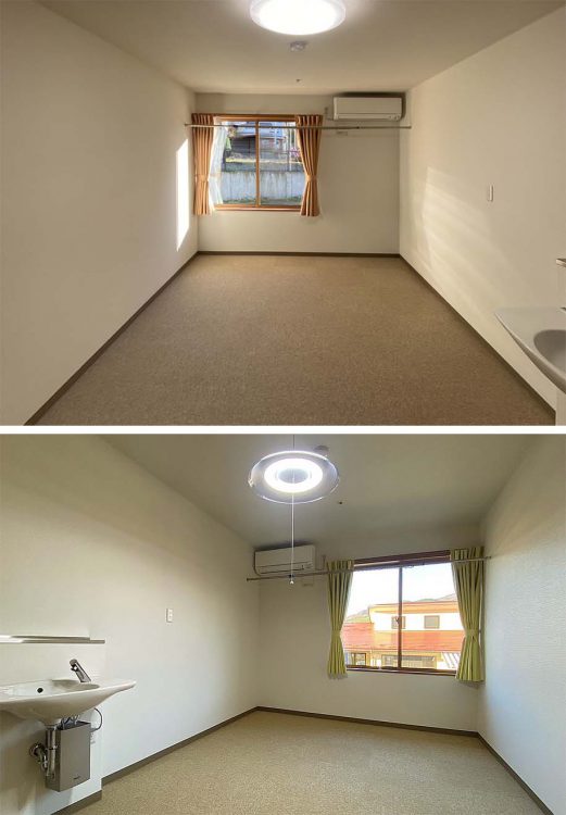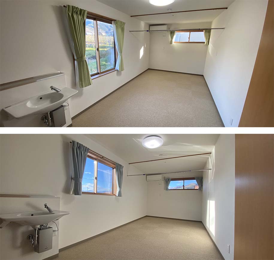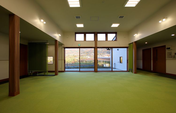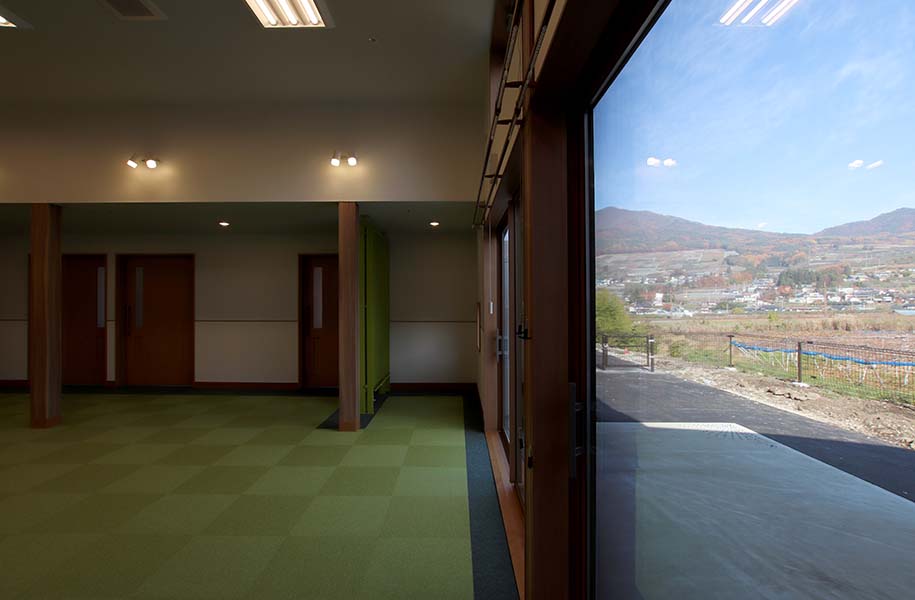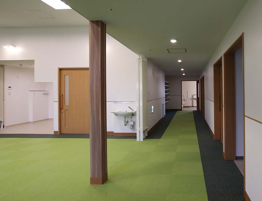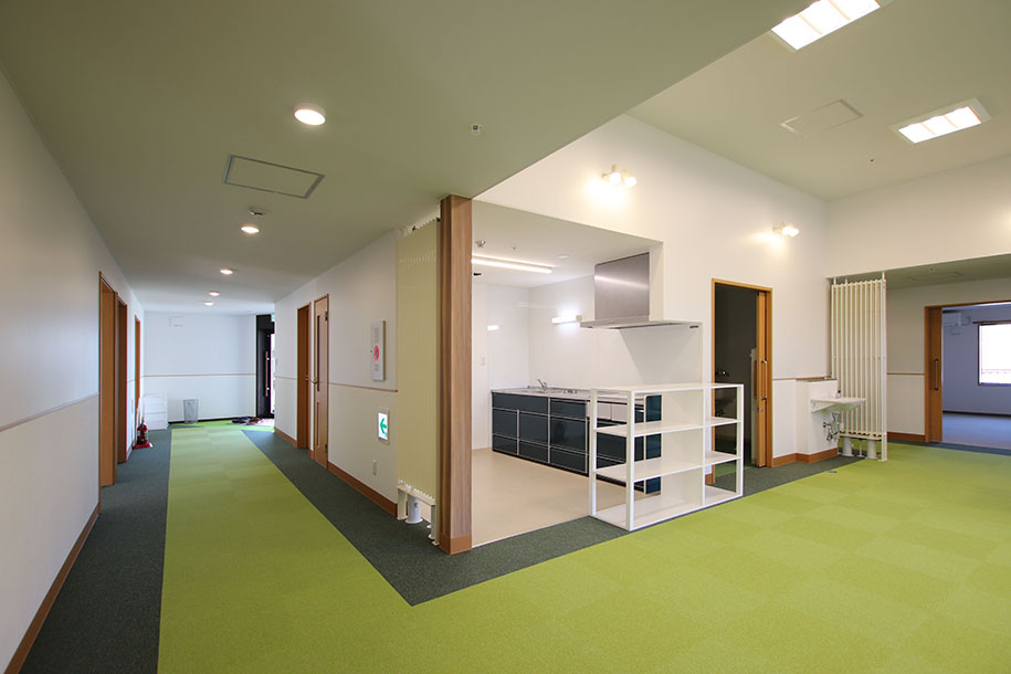 高社山への眺望を重視し建物配置と窓を計画した。パブリックゾーン(広間)では“みんなが集う公園”を、プライベートゾーン(個室)では‟落ち着きのあるわが家”をイメージし、床の色をそれぞれグリーンとブラウンとした。パブリックゾーンには、みんなと つかず離れずの距離を保てる“公園の木陰のベンチ”のような空間も用意し、さまざまなシーンに対応できるよう配慮。また 冷暖房設備には、住宅としての高い居住性・快適性を確保するためパネルヒーターが採用されている。