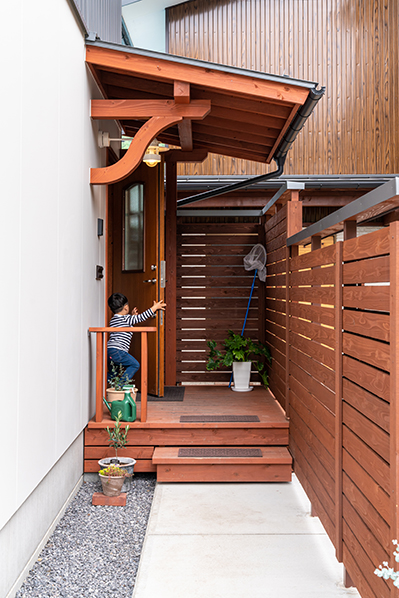 母屋との関係を考えた絶妙な板塀の設け方、無理せず楽しめる庭、カーポート位置など、