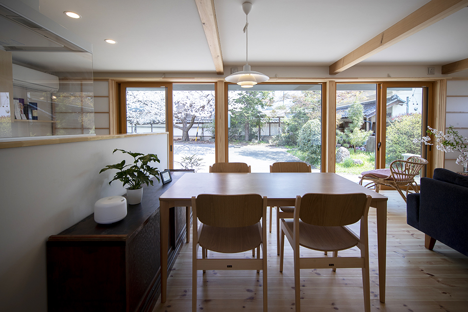 お屋敷の大きな桜をみるために、東向きに大窓を開けて縁側のようなウッドデッキがあります。