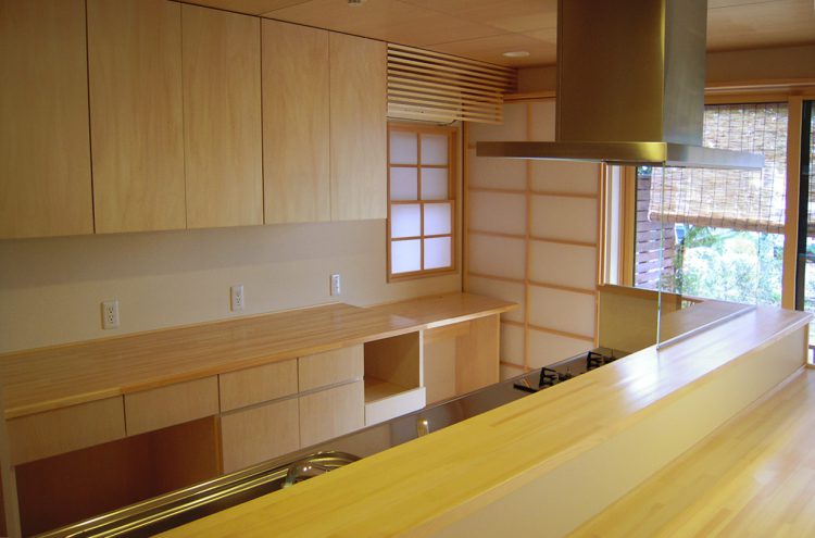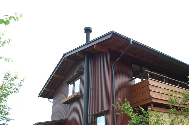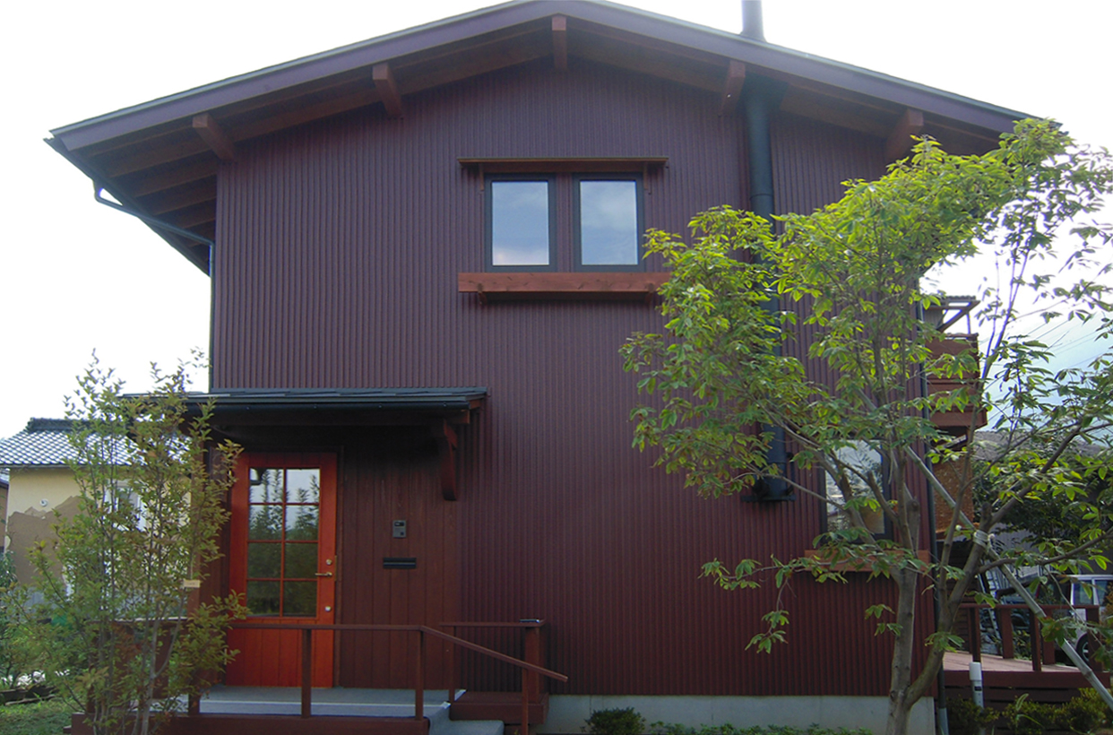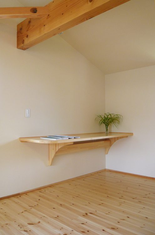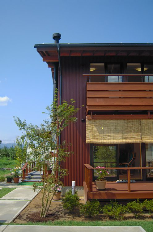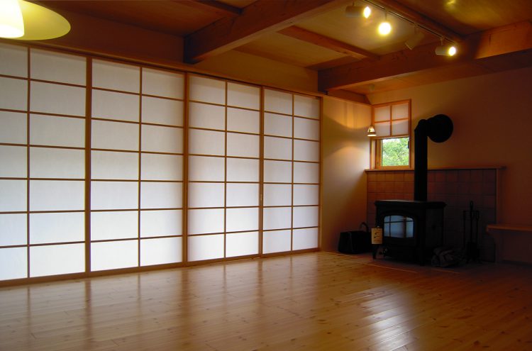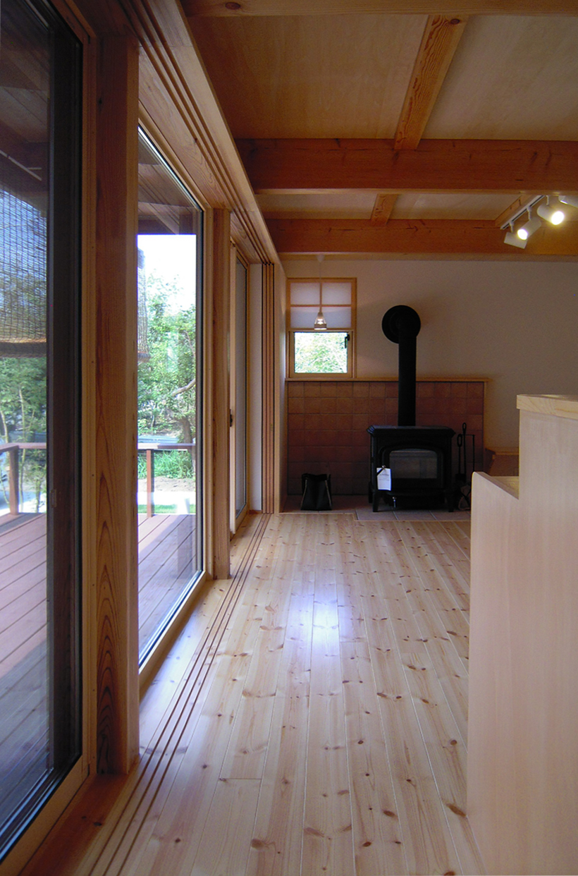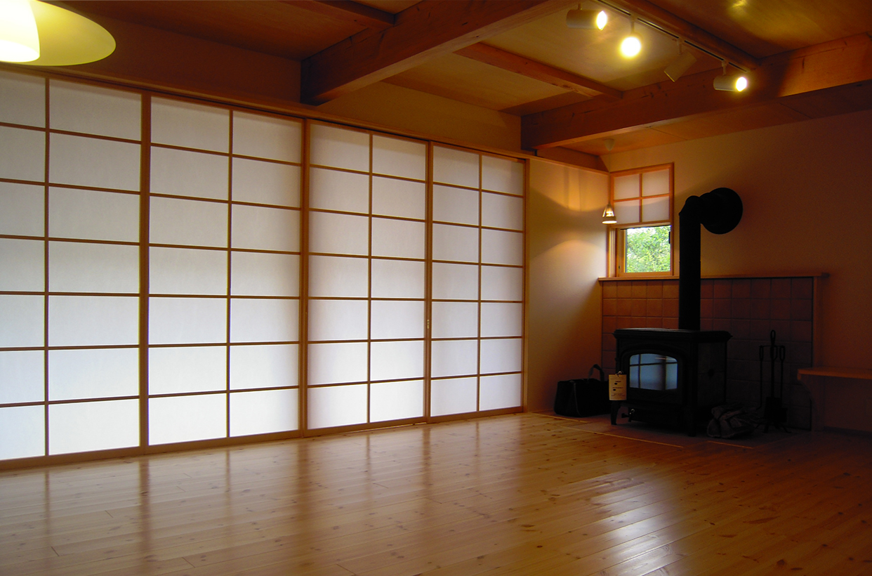母屋の敷地の隣に建つ、「誠の家Ⅰ」。薪ストーブを備え、ゆったりした時間を愉しむ。2階フリースペースは3人の子ども達が自由に区切ってつかう。