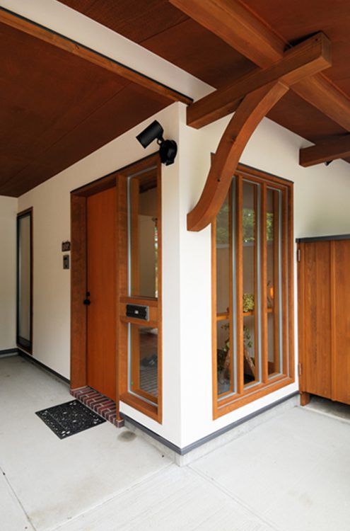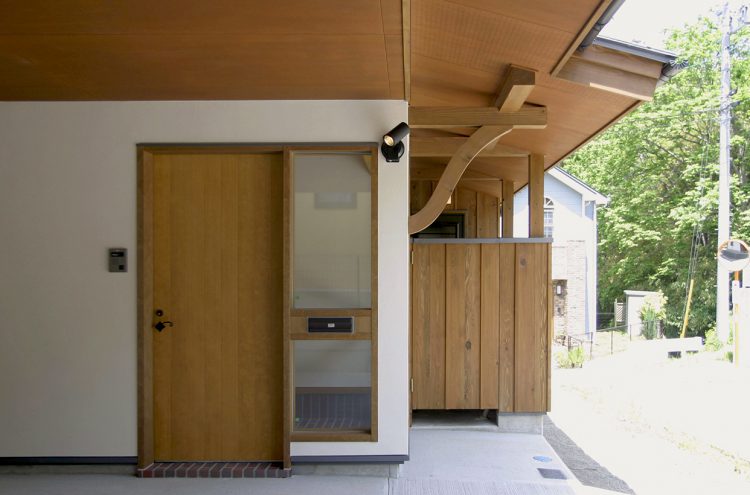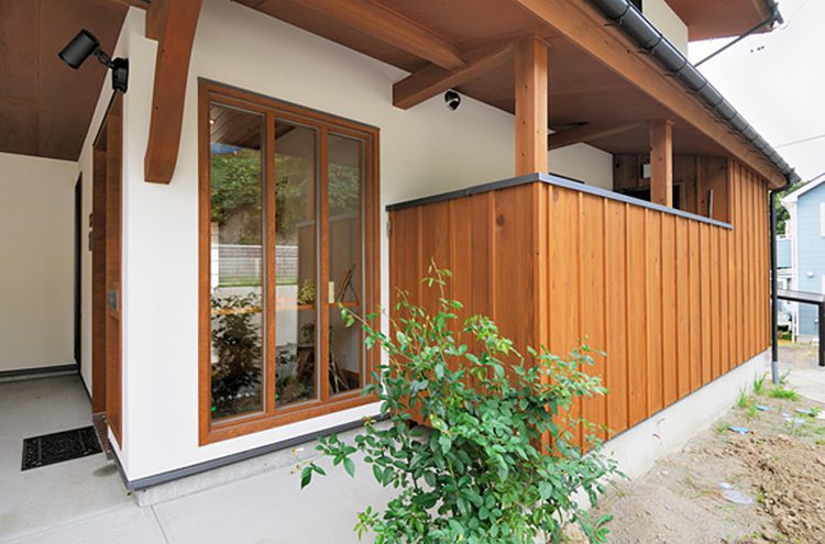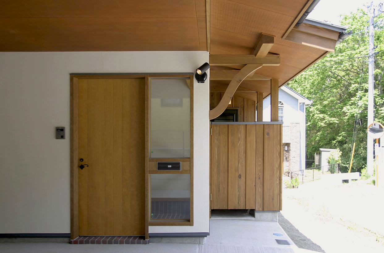 玄関アプローチにはビルトインガレージの深い軒がかかり、オーナーさんの個性で彩られたシンプルな空間が拡がる。