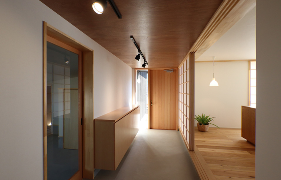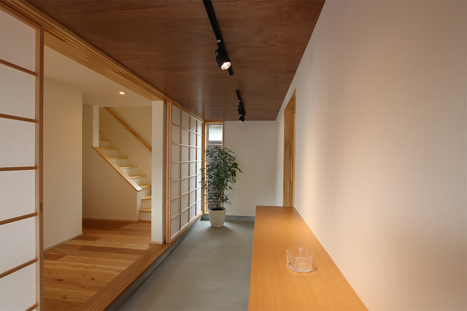 ギャラリーでもある土間の玄関を介し、おすまいとアトリエを配置。