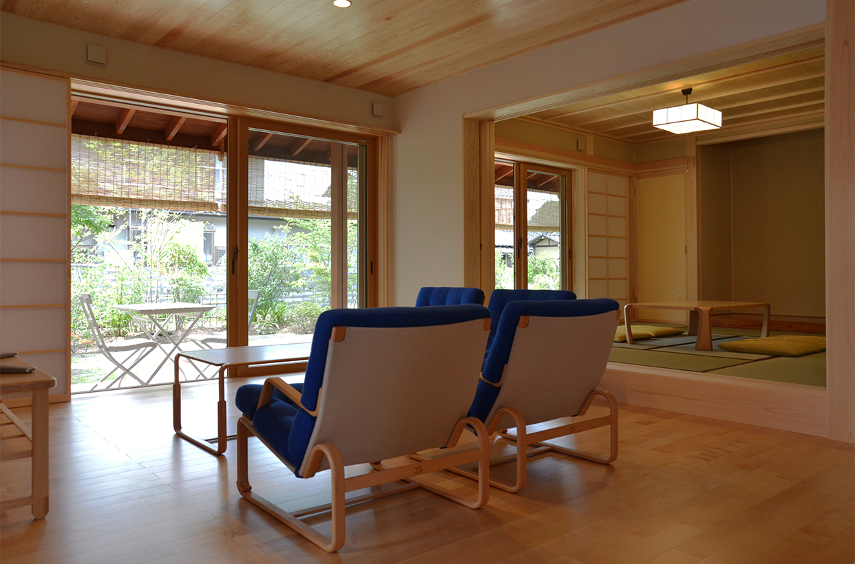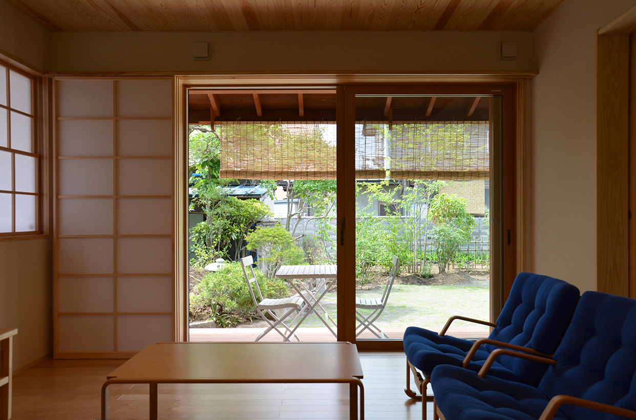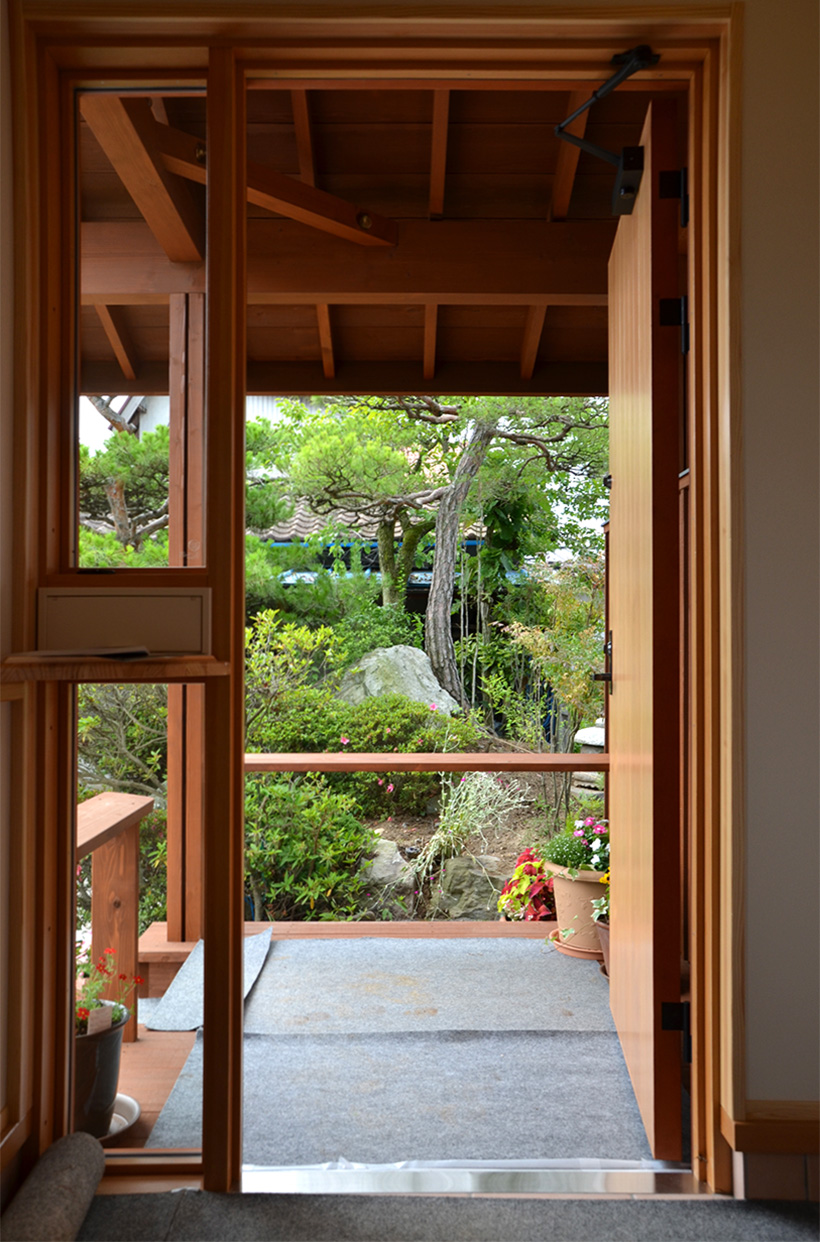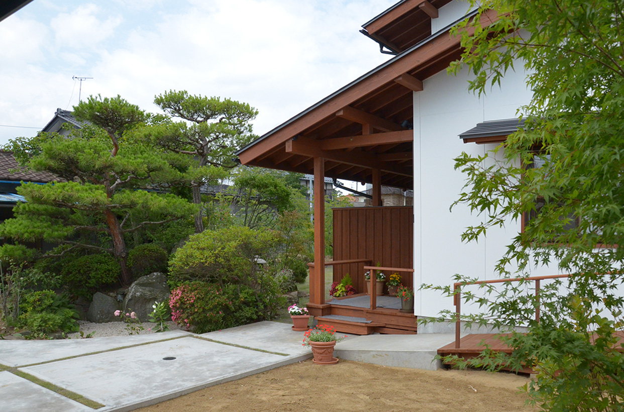 隣接するふたつの家を取り壊し、ふたつの敷地を連結させて建築された和モダンの家。既存の和の庭・畑の庭の中にバランスよく建物を配している。玄関前には和の庭が、リビングからは清々しい芝の庭が、キッチン・ダイニングからは季節ごとに表情をかえるモミジが見える。四季折々の気持ちのいい景色と共に暮らせる住まいです。