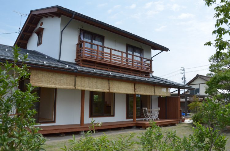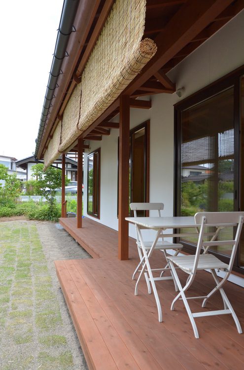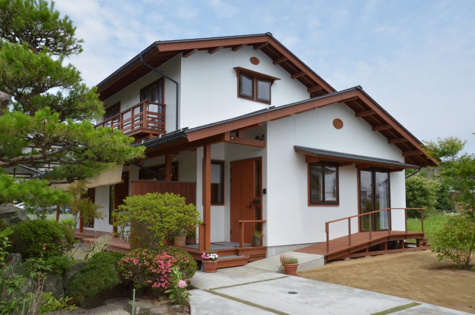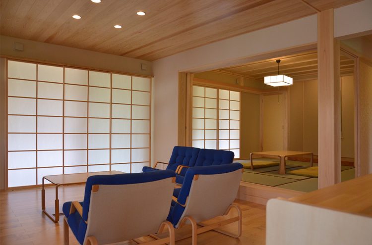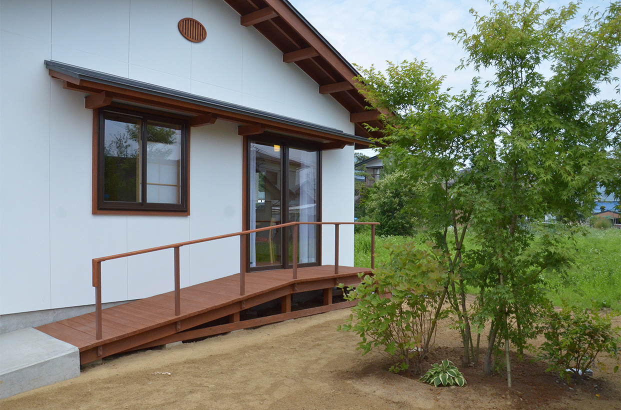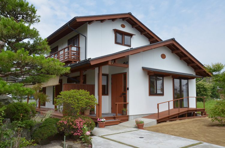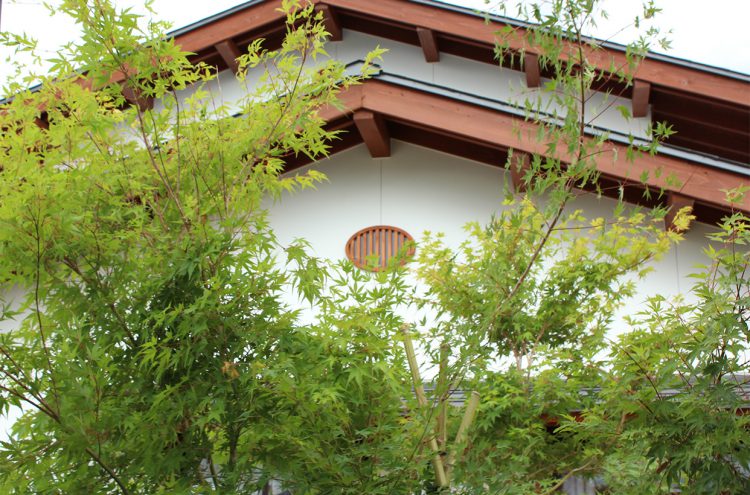 隣接するふたつの家を取り壊し、ふたつの敷地を連結させて建築された和モダンの家。既存の和の庭・畑の庭の中にバランスよく建物を配している。玄関前には和の庭が、リビングからは清々しい芝の庭が、キッチン・ダイニングからは季節ごとに表情をかえるモミジが見える。四季折々の気持ちのいい景色と共に暮らせる住まいです。