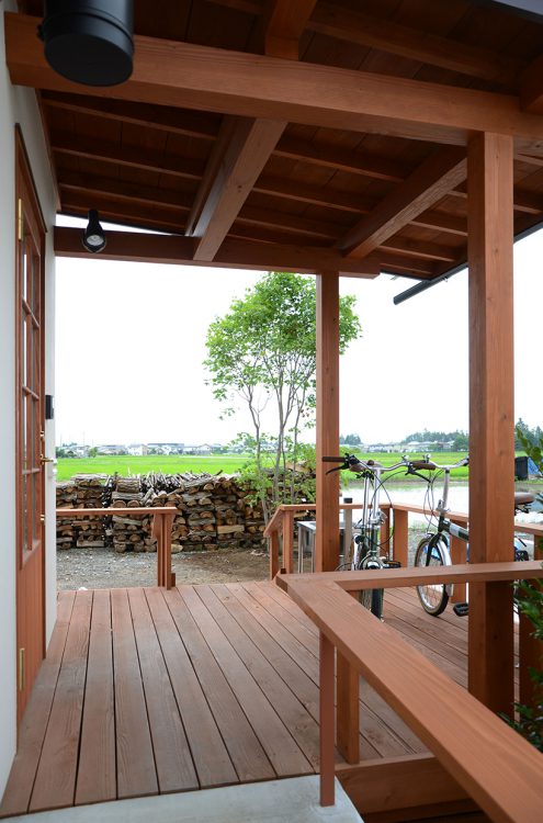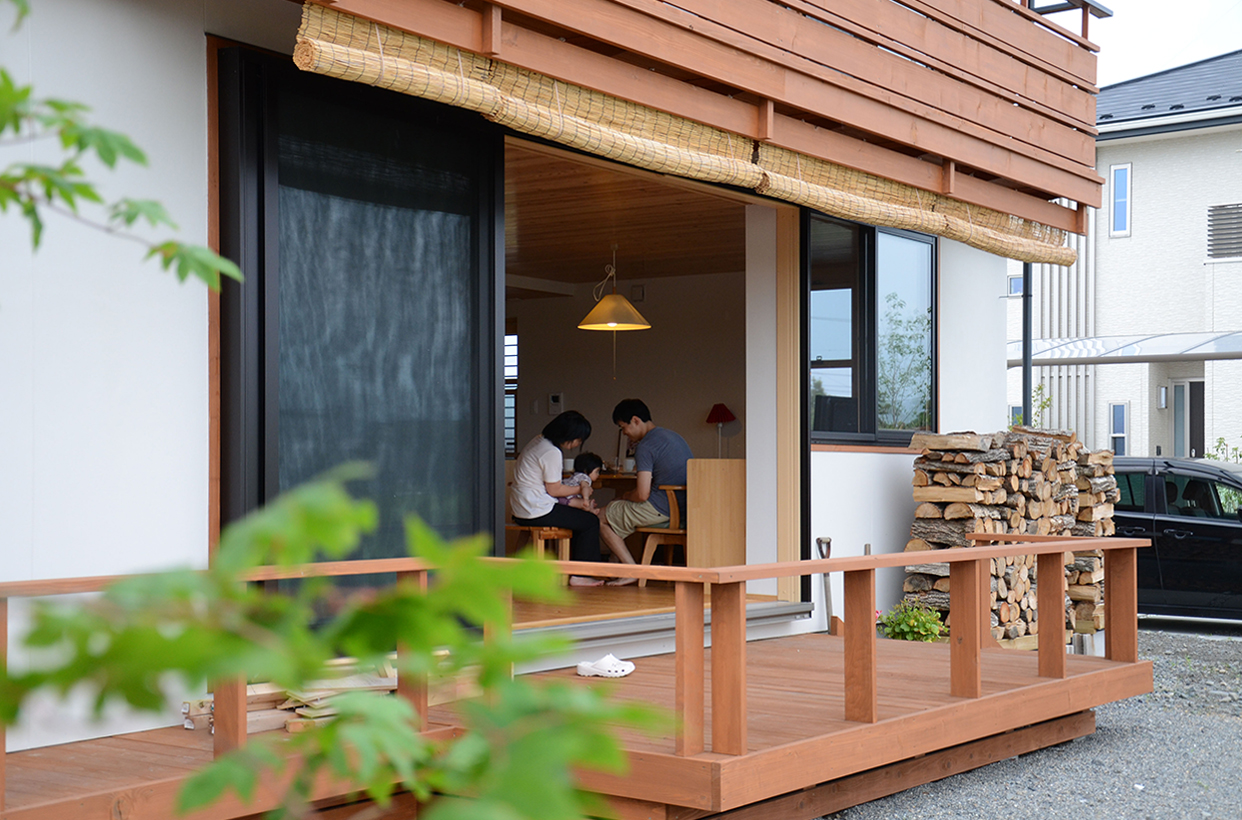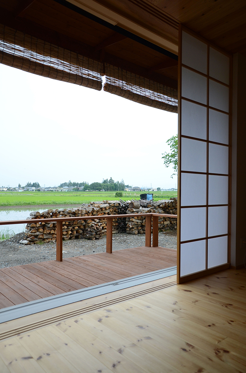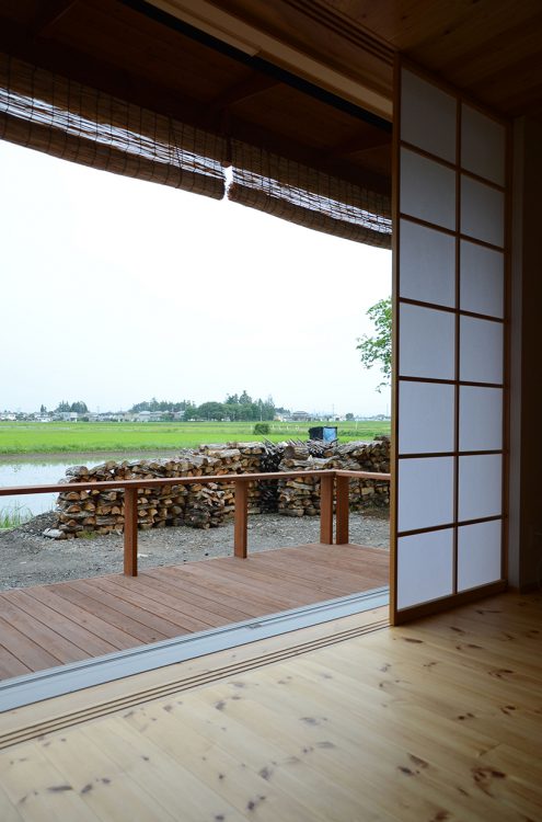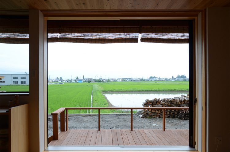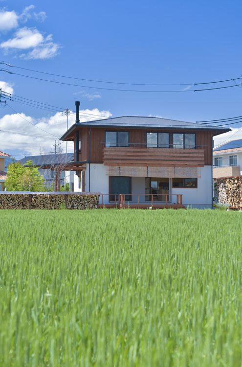 安曇野の田園地域に建つ、29坪の家。玄関を入ると土間に薪ストーブが据えられている。障子を開けるとそのままLDKにつながる。リビング正面の大開口サッシを開けると、デッキ、庭、田園風景、山並みへとつながるのどかな景色が広がる。料理好きな夫妻のために、作業性や収納力、キッチンからみえる景色など、細部にわたって考え抜かれている。