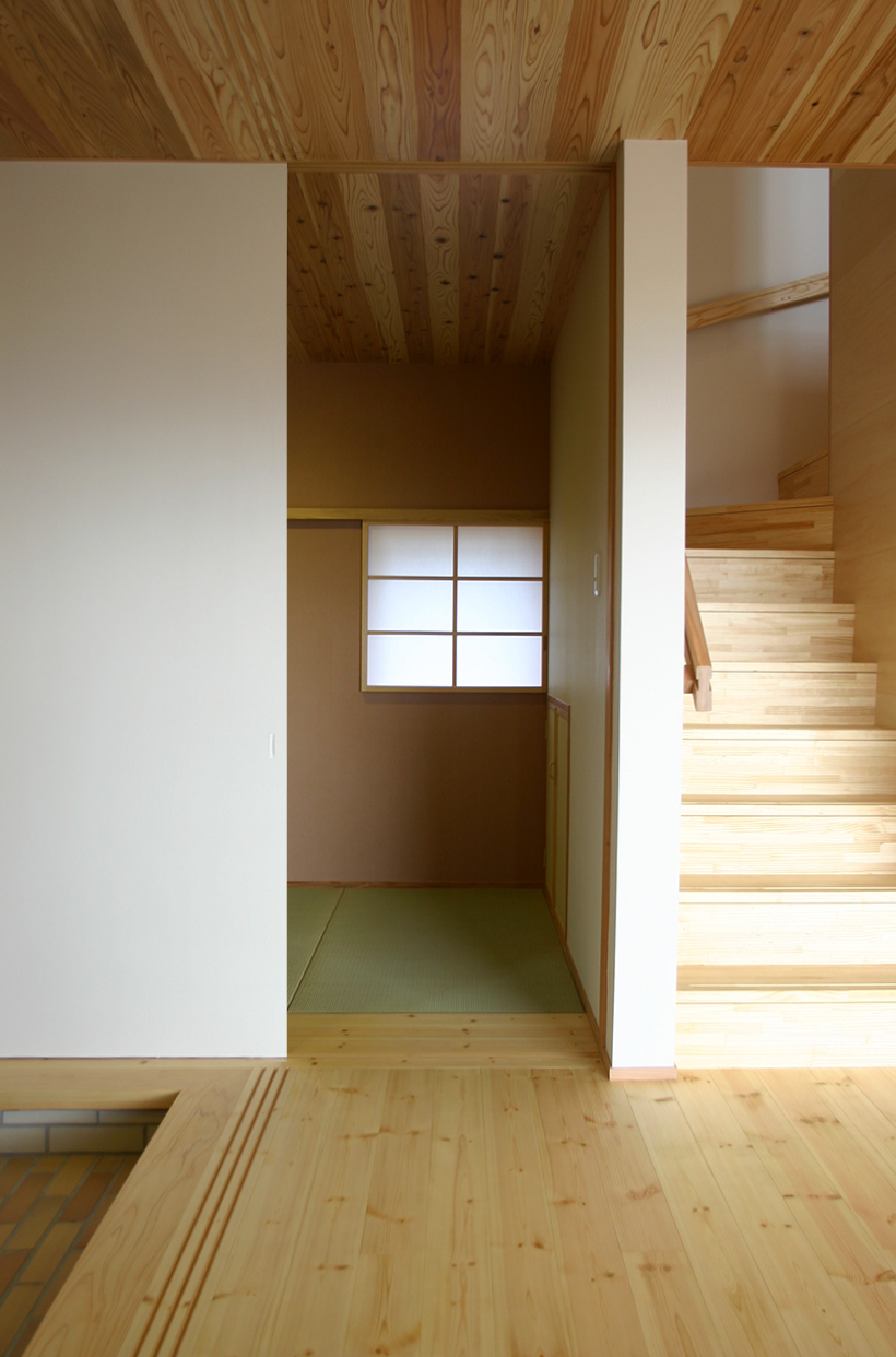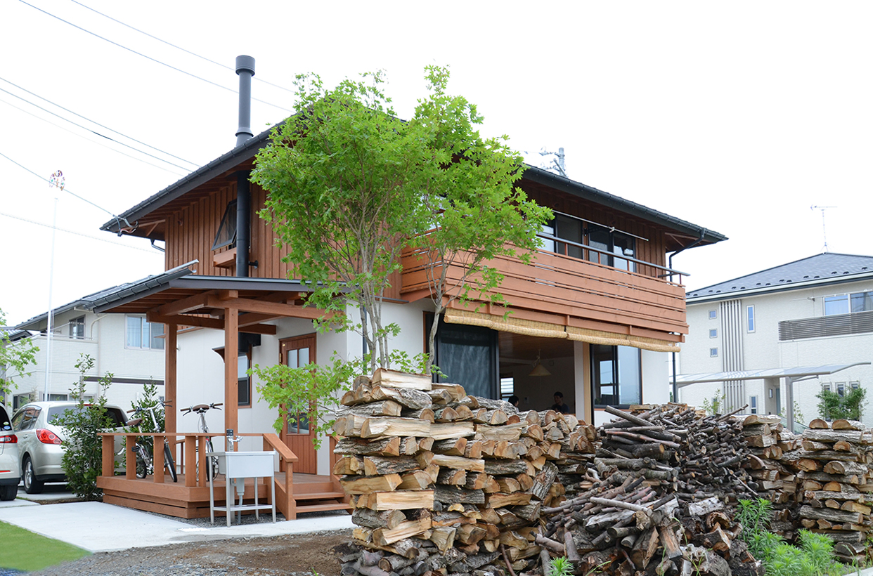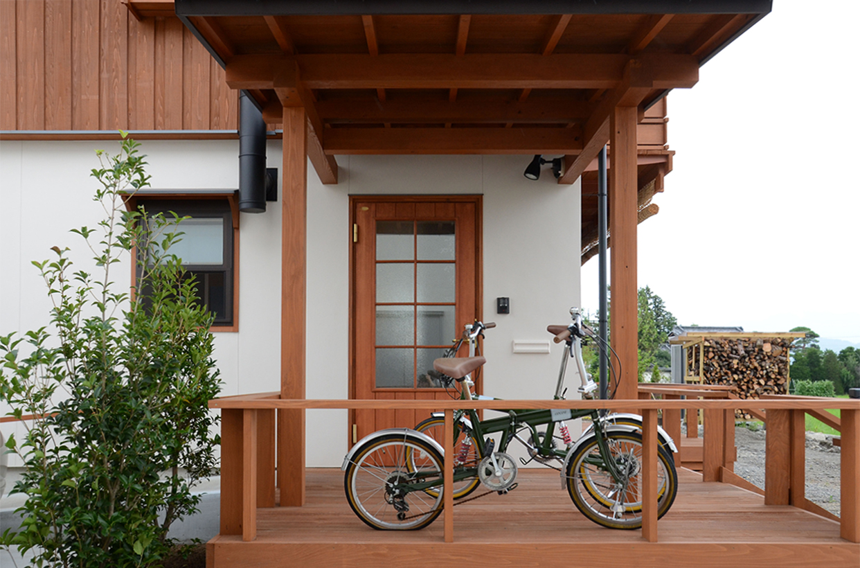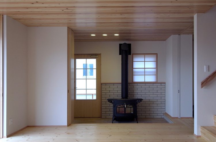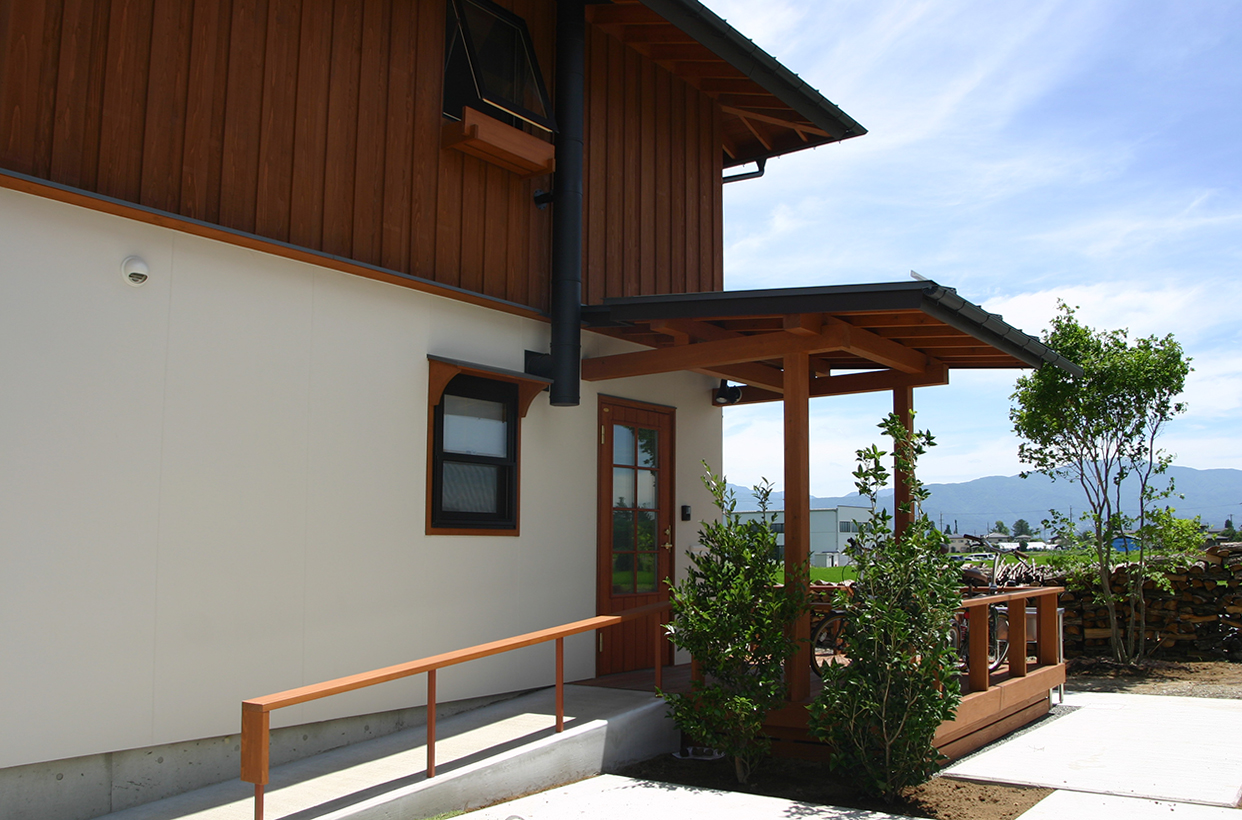 安曇野の田園地域に建つ、29坪の家。玄関を入ると土間に薪ストーブが据えられている。障子を開けるとそのままLDKにつながる。リビング正面の大開口サッシを開けると、デッキ、庭、田園風景、山並みへとつながるのどかな景色が広がる。料理好きな夫妻のために、作業性や収納力、キッチンからみえる景色など、細部にわたって考え抜かれている。