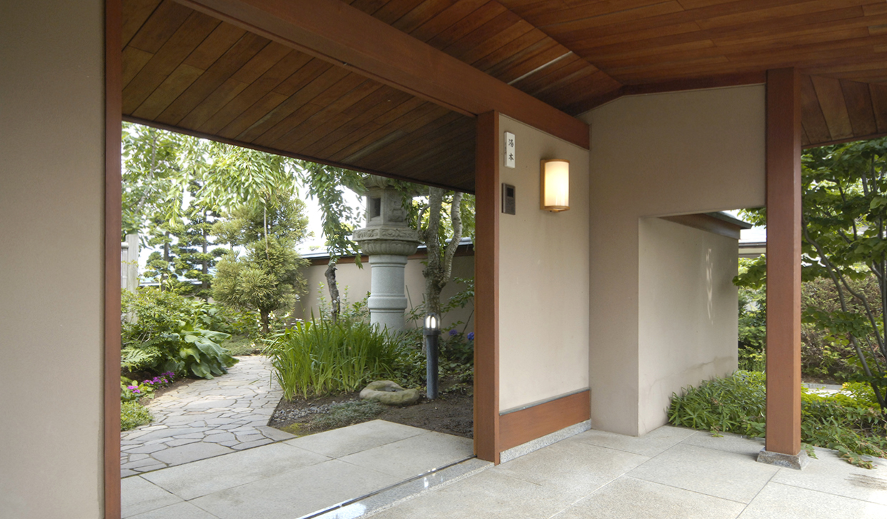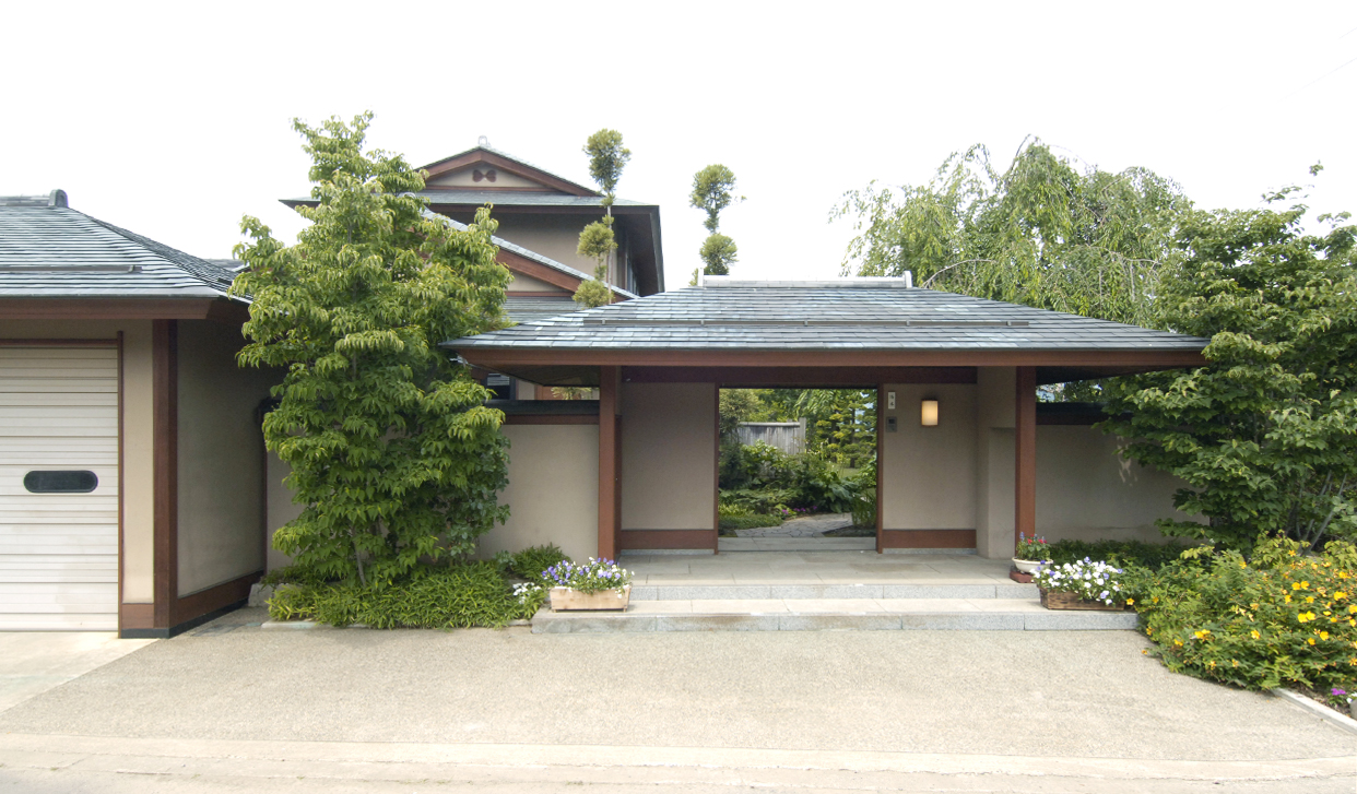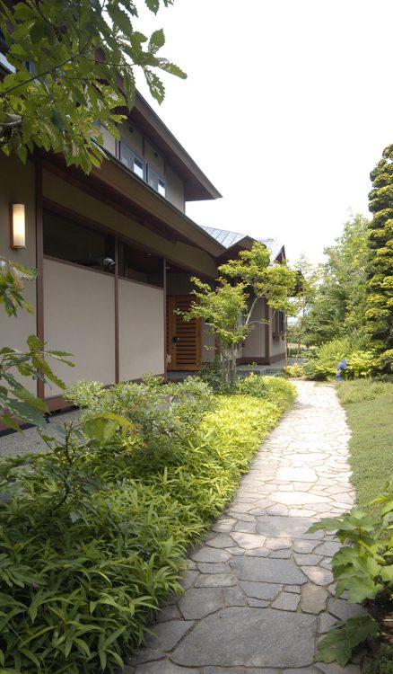 緑がのぞく景色を眺めて門をくぐり、季節の草花が彩る小径を歩くとゆったりとした玄関にたどり着く。