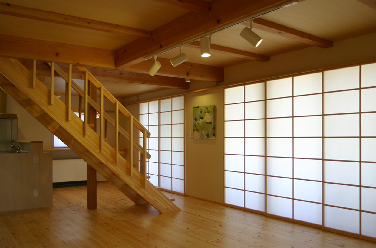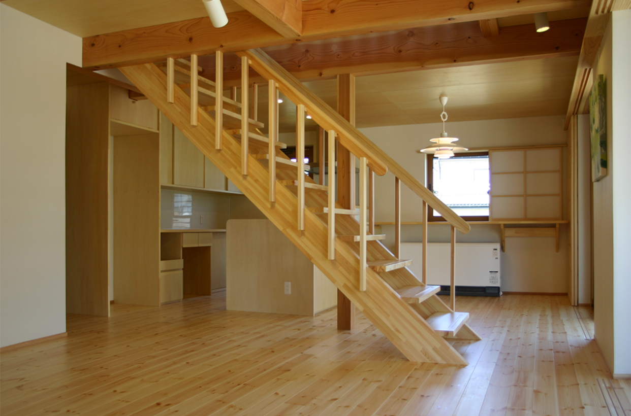 LDKの中央にささら桁階段を配した住まい。