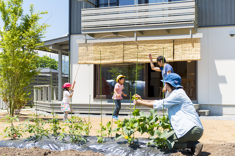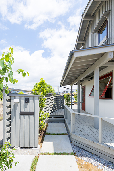 人と自然とがつながる暮らしがここにあります。玄関ポーチから続くウッドデッキは、