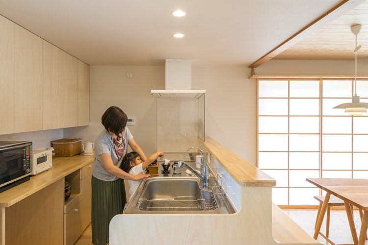家と庭を結ぶリビングの延長。土間を兼ねた玄関には、薪ストーブも導入。