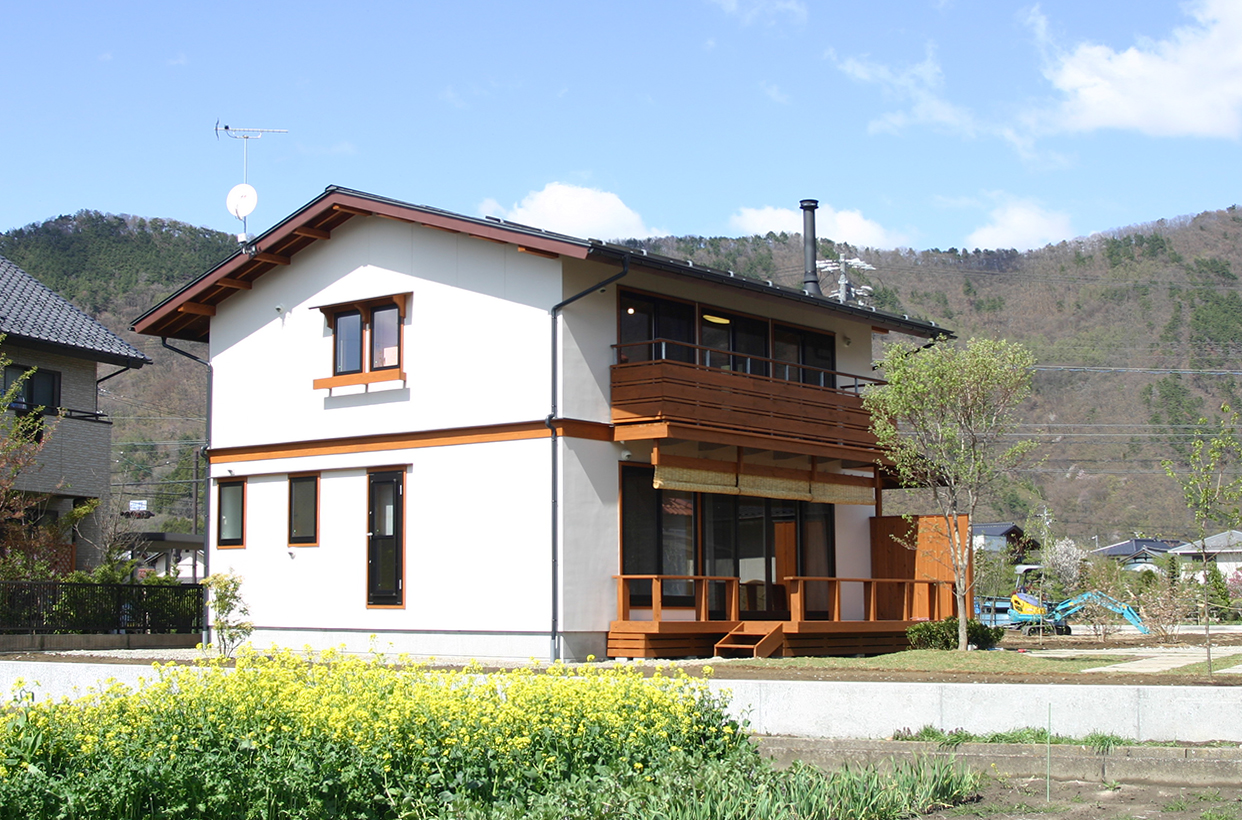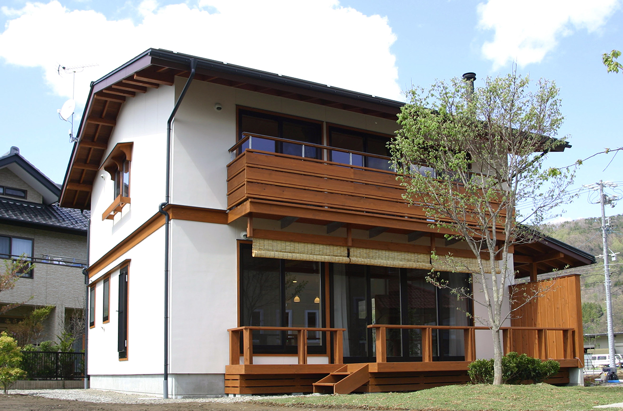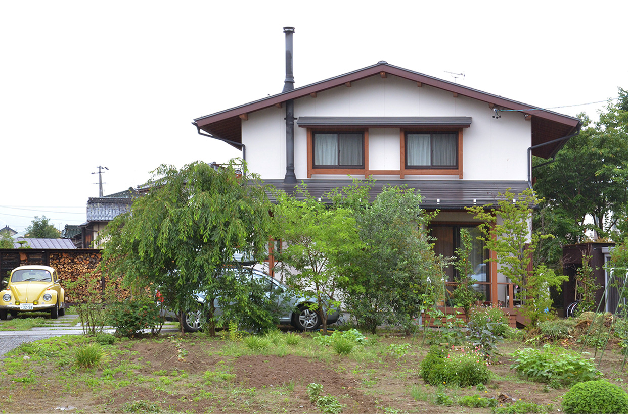 三角屋根とシンメトリーのふたつの窓、横に伸びる煙突が印象的な住まい。2010年に竣工した白壁の家は、庭の緑が成長し、鮮やかなコントラストを見せている。専用のウッドデッキを持つキッチンや、家具によって仕切られた可変性の高い2階のプランが特徴。