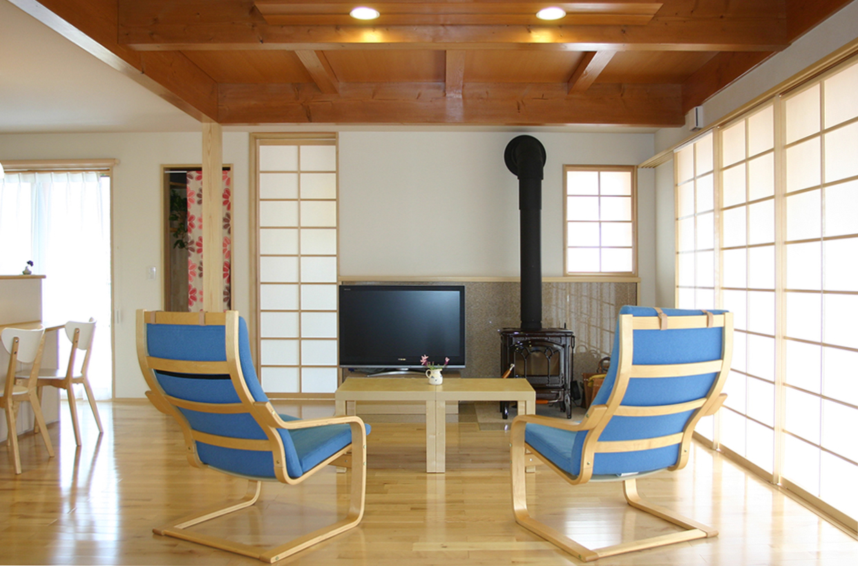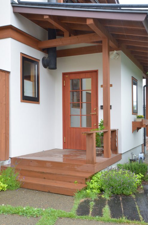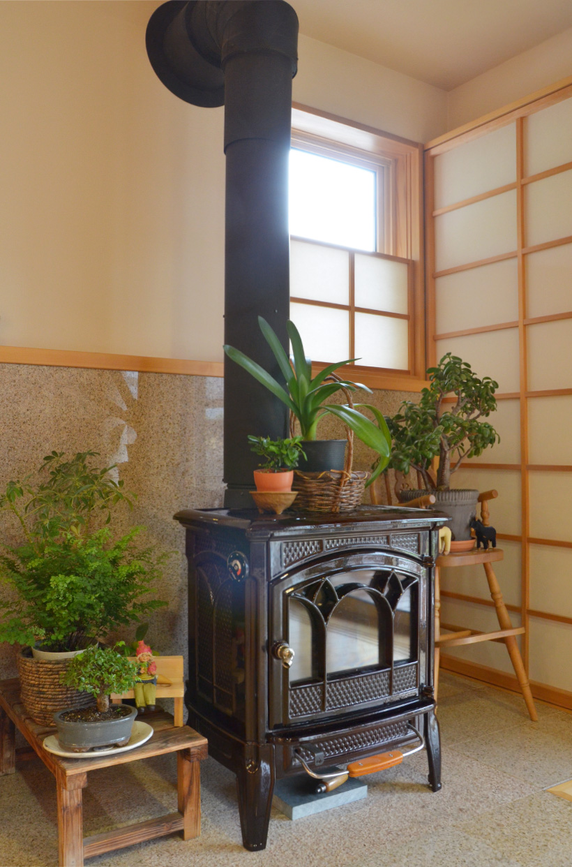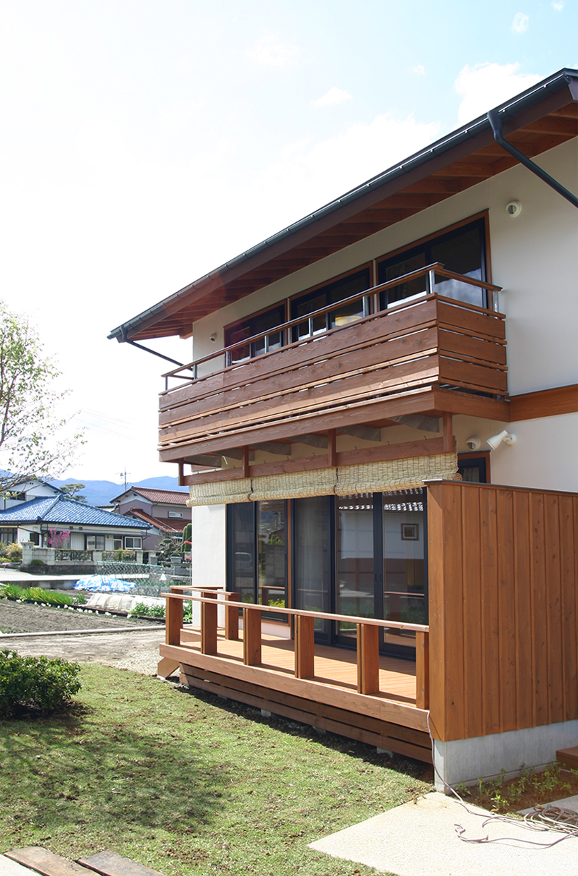 三角屋根とシンメトリーのふたつの窓、横に伸びる煙突が印象的な住まい。2010年に竣工した白壁の家は、庭の緑が成長し、鮮やかなコントラストを見せている。専用のウッドデッキを持つキッチンや、家具によって仕切られた可変性の高い2階のプランが特徴。