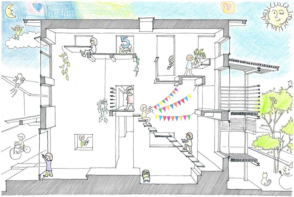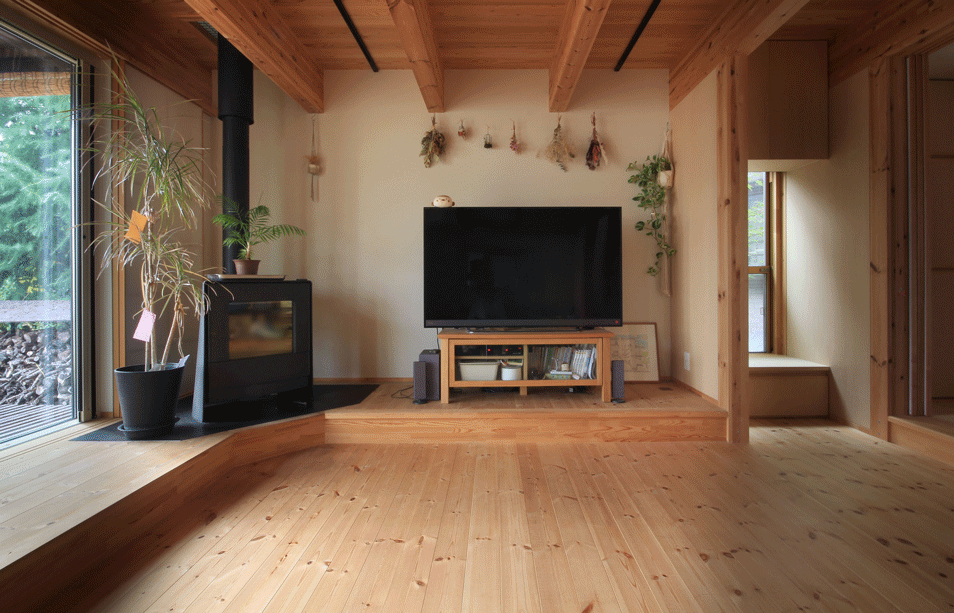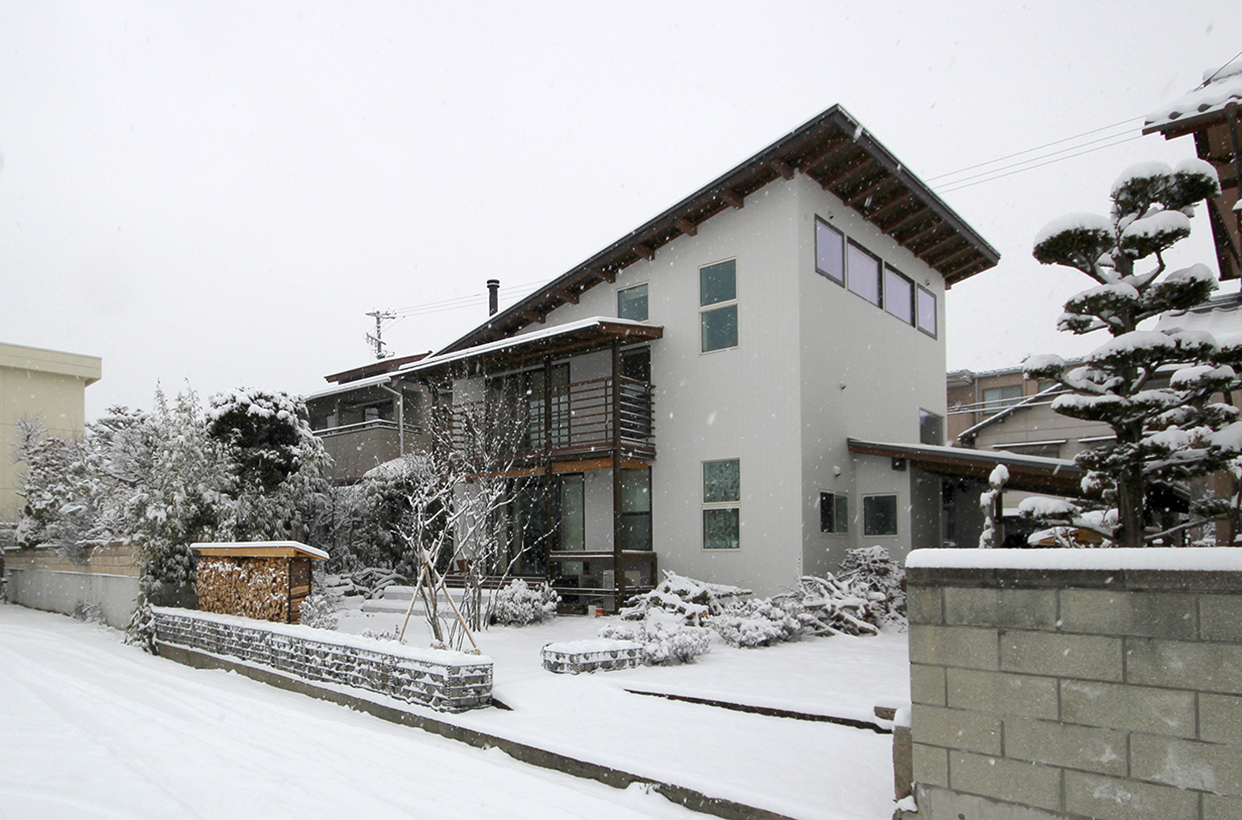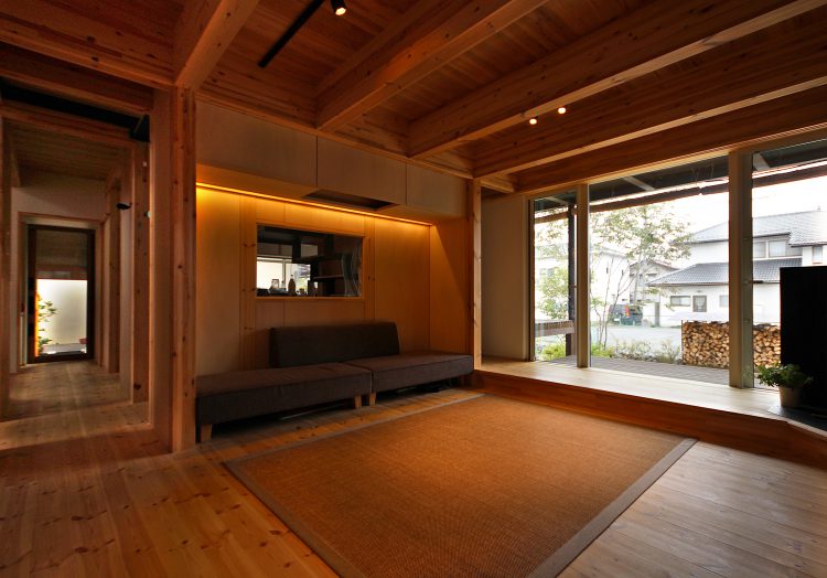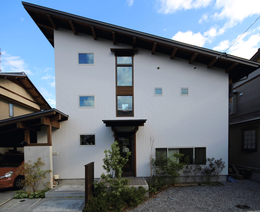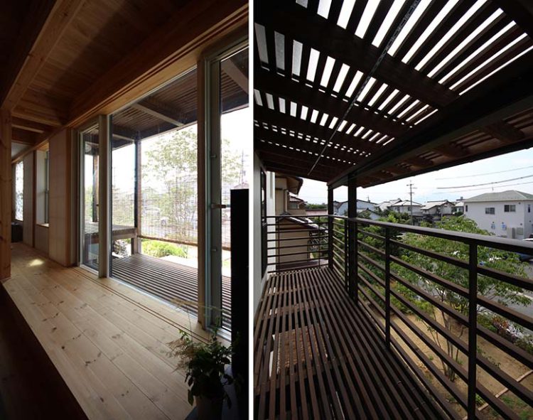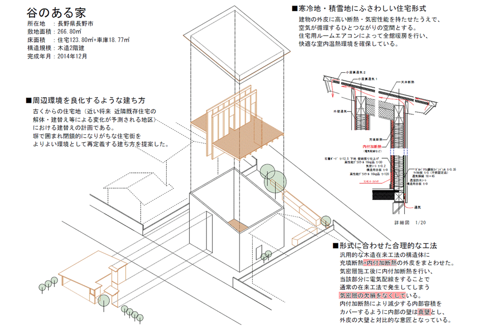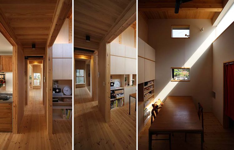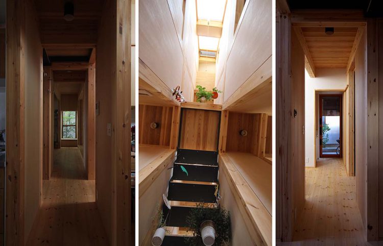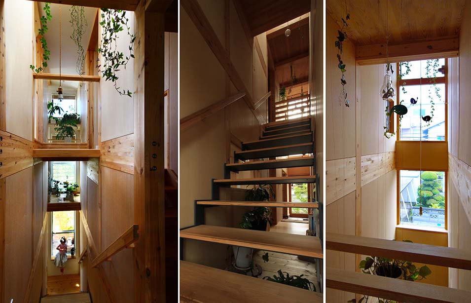 多くの窓を持ち開放的でありながら、ニッチ状の落ち着きある居場所を随所にしつらえている。視線が抜けるように配置された窓からは、移動するたびに外の風景が目に入り、季節や天気の移ろいを感じる。中央にはこの家を象徴する谷状の吹抜け空間があり、そこに架けられたいくつかの橋には観葉植物が置かれている。その緑は屋内外の風景をつなぎ、奥行き感を増すことに一役買っている。