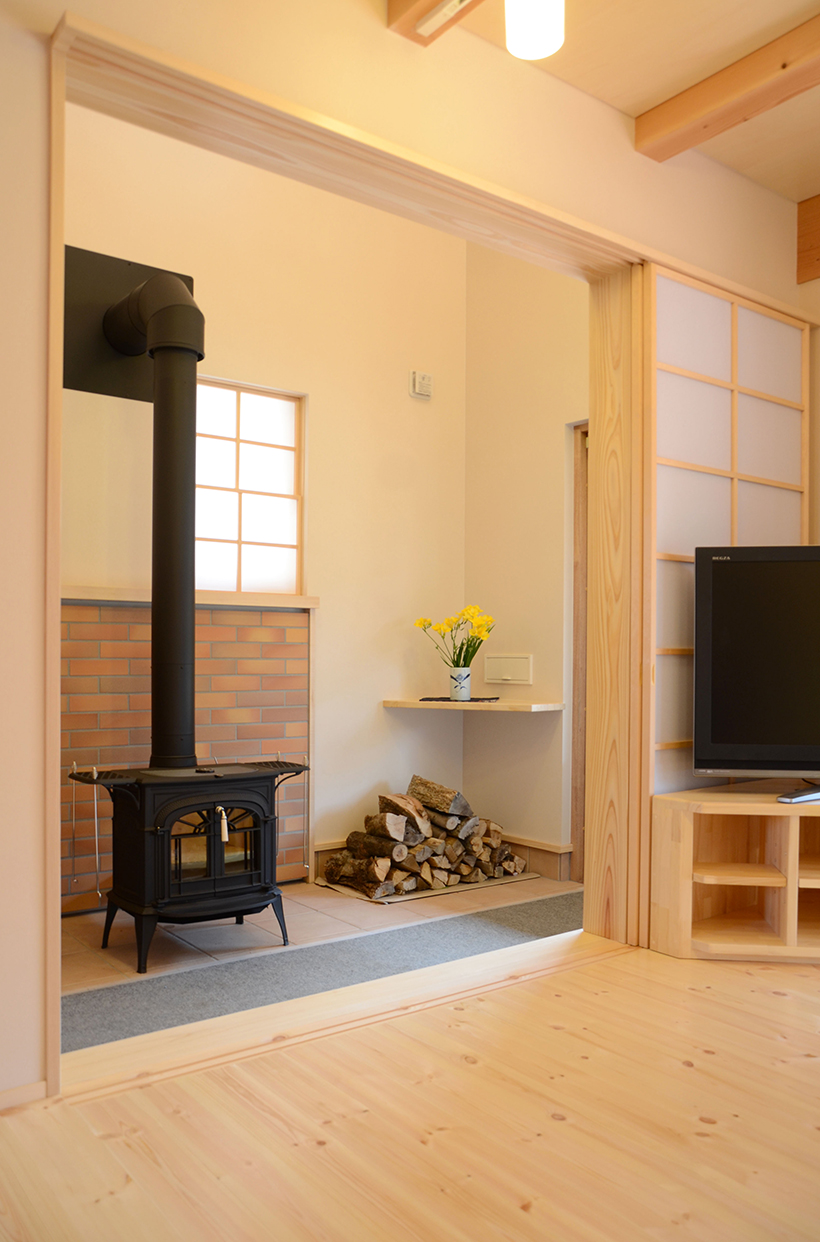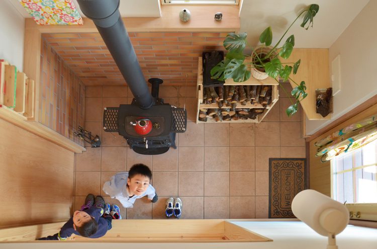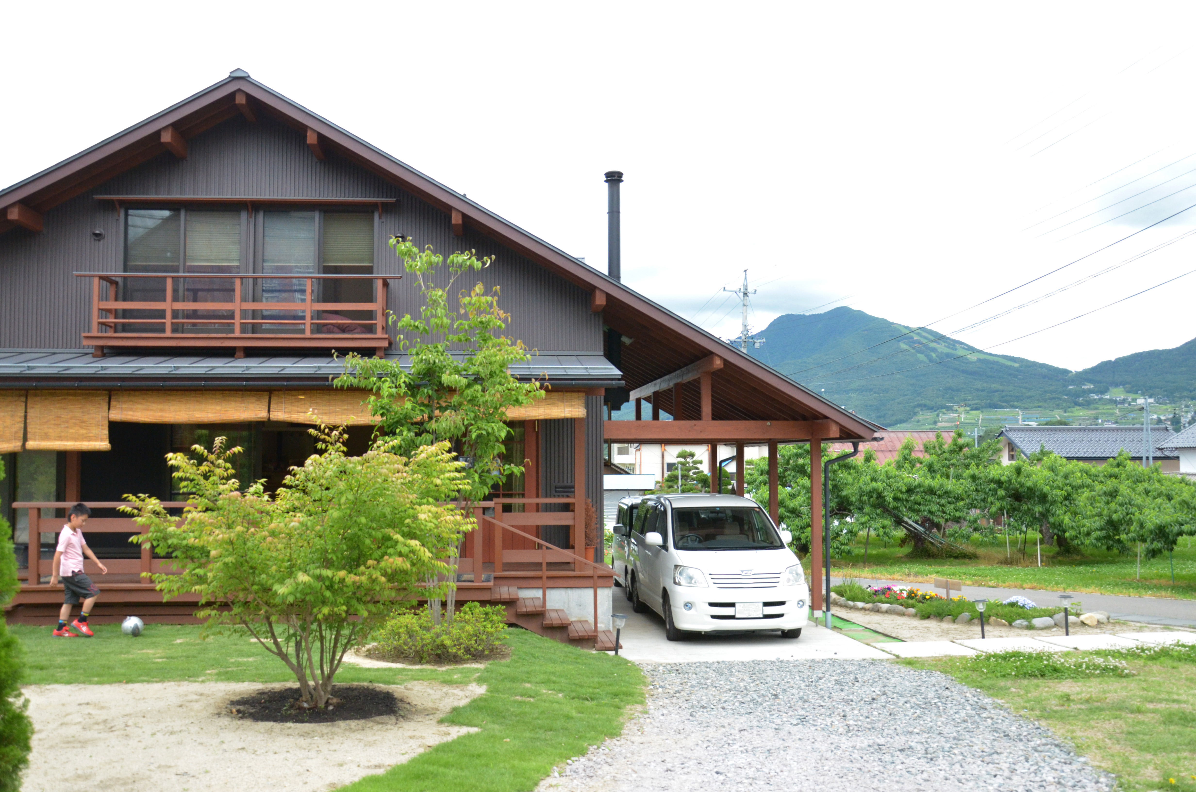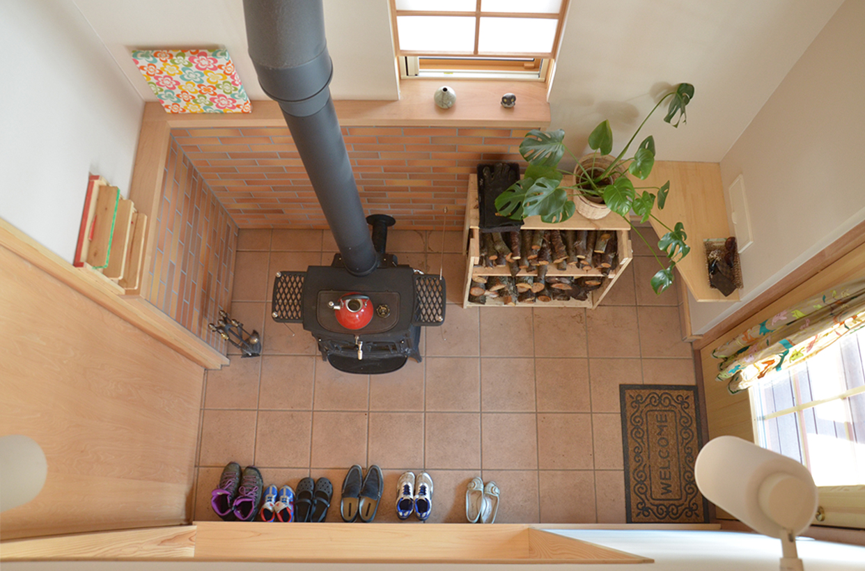 地域に共用温泉を持つ、長閑な山間の集落に建つ4人家族の住まい。玄関は、広い開口のままリビングに続く土間玄関。深い雪に覆われる冬も、玄関をあけるとすぐに薪ストーブが暖かく出迎えてくれる。1階は開放的な空間構成ながら、食事スペースには落ち着きを求め、"囲われる安心感"のある空間とした。窓からは、四季折々の高社山が望める。
