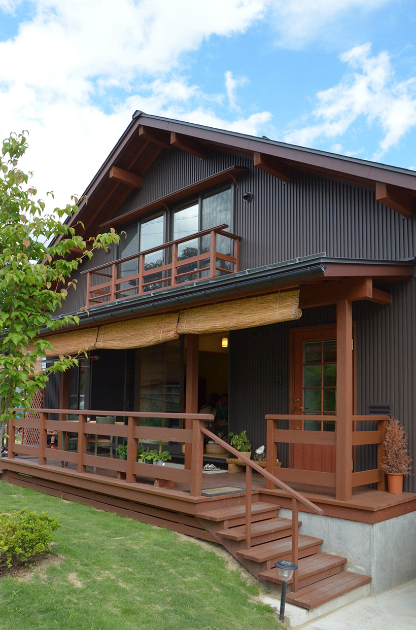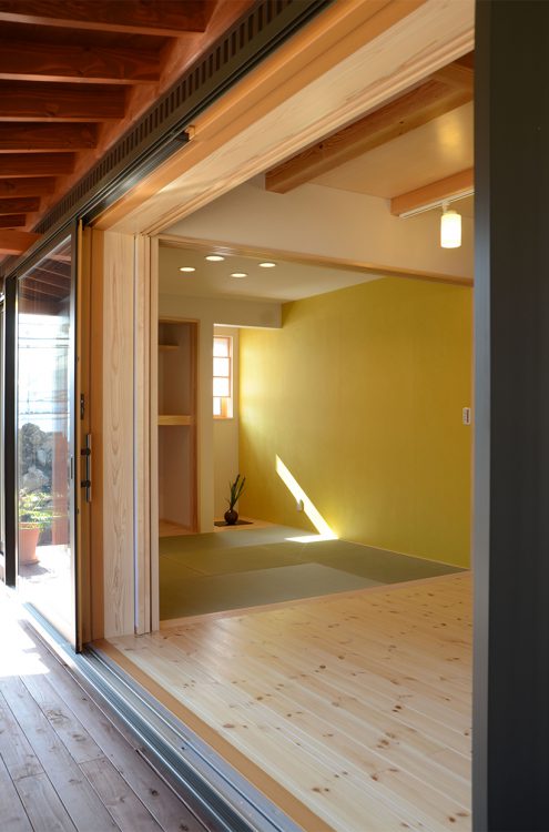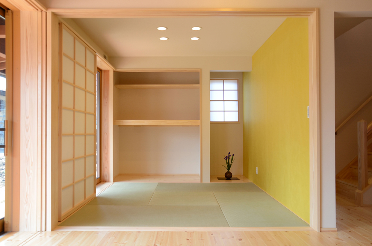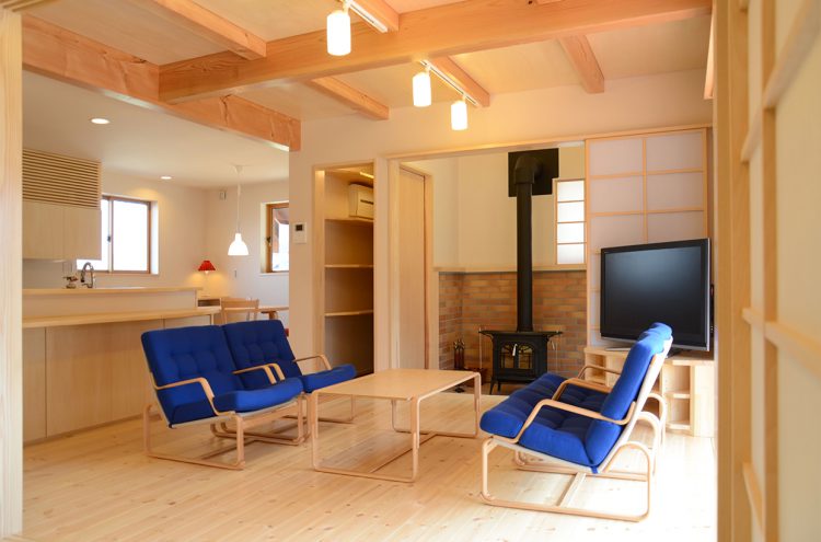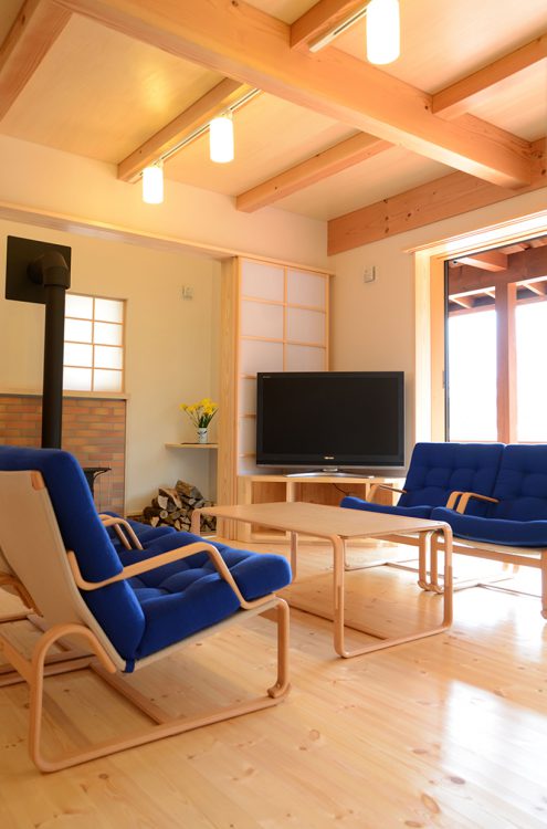 地域に共用温泉を持つ、長閑な山間の集落に建つ4人家族の住まい。玄関は、広い開口のままリビングに続く土間玄関。深い雪に覆われる冬も、玄関をあけるとすぐに薪ストーブが暖かく出迎えてくれる。1階は開放的な空間構成ながら、食事スペースには落ち着きを求め、"囲われる安心感"のある空間とした。窓からは、四季折々の高社山が望める。