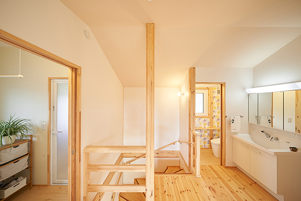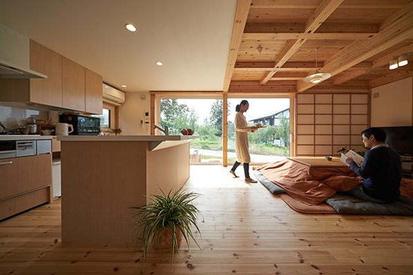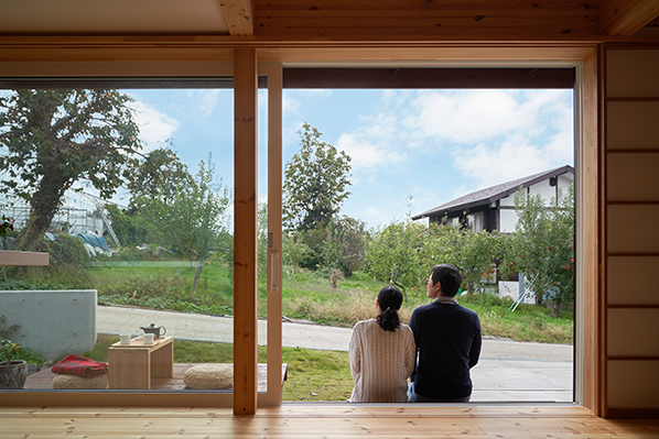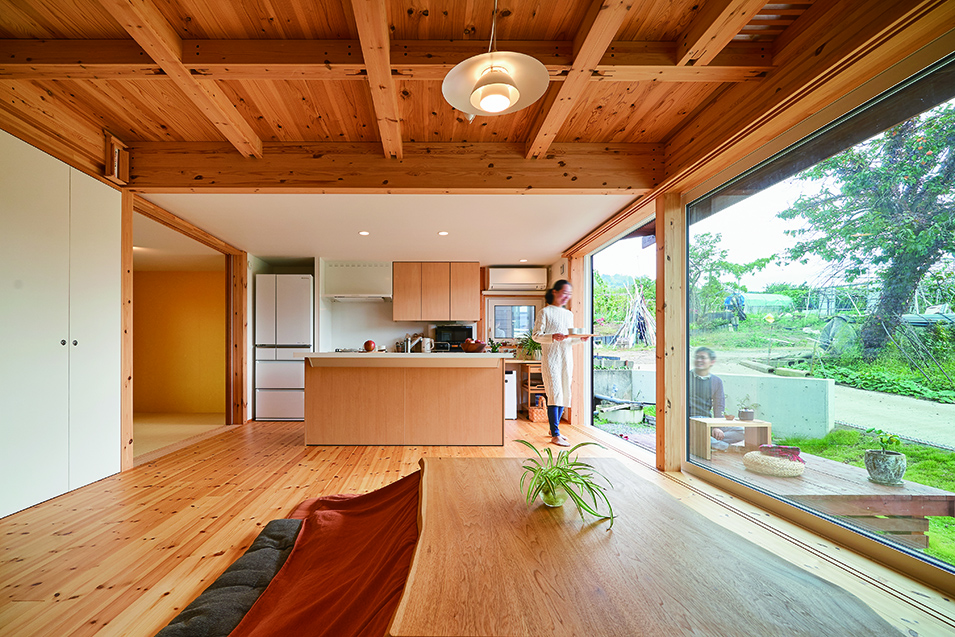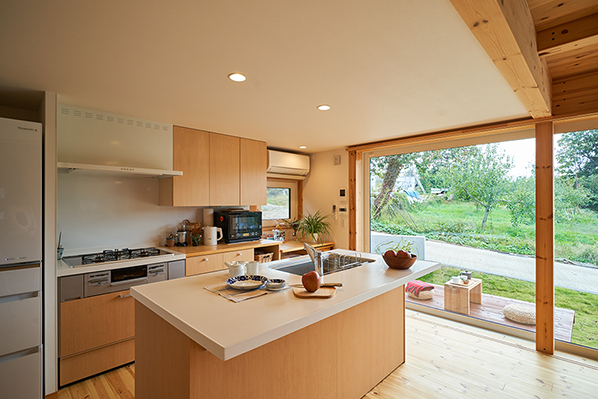 シンク側に広めのオープンキッチンとして忙しい朝の食事スペースに活用している。まわりをリンゴ畑に囲まれた高社山の麓の立地。眺望に恵まれたリビングの大開口からは四季の移り変わりが楽しめる。大窓から心地よさと豊かさを頂く。