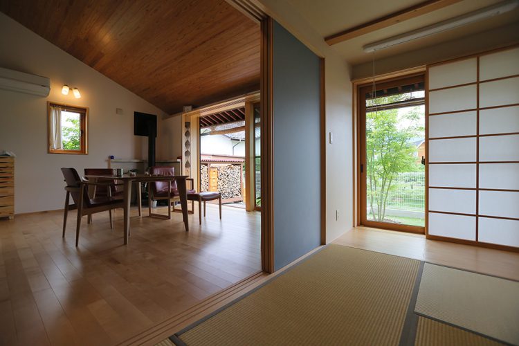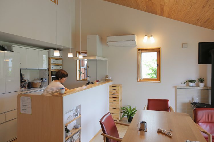 片流れ屋根の特徴を生かし、広がりのある斜め天井の空間。