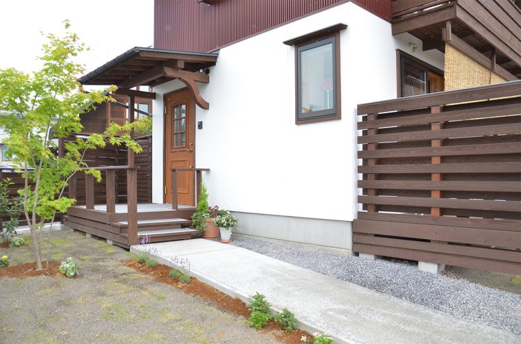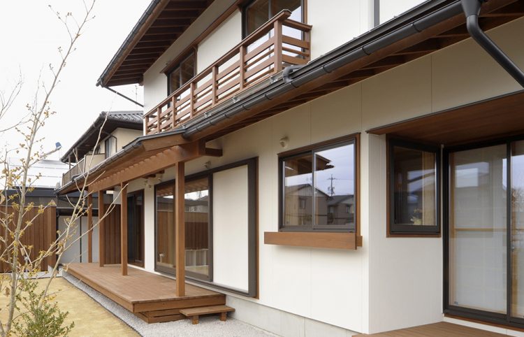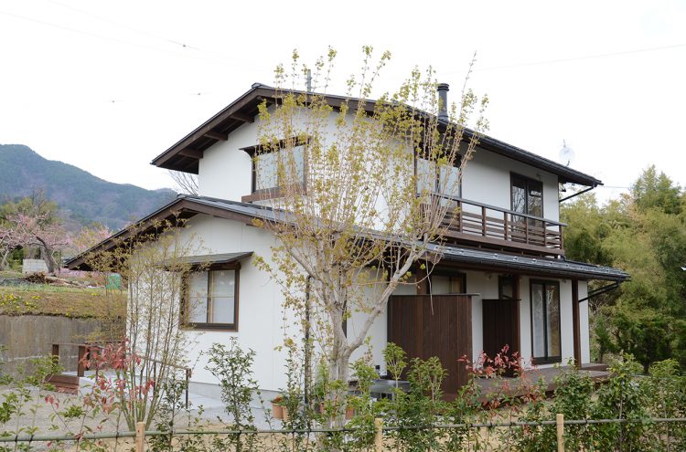 冠着山を望むぶどう畑の中に建つ片流れの家。1階には、リビングからつながる大きなウッドデッキ…