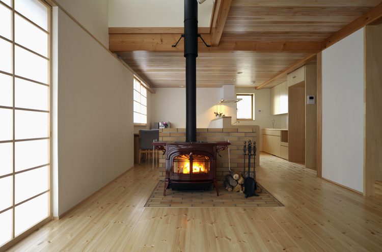 西斜面に建つ片流れ屋根の家。LDKの中央に薪ストーブを据え、家族の拠りどころに。大開口を開…